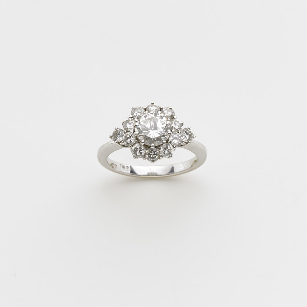Anello in oro bianco con dodici diamanti rotondi taglio a brillante a contornare un centrale di ct 1,02, g. 4,40 misura 14/54 Accompagnato da analisi gemmologica del CISGEM diamond report n. 3131IAA del 07/04/2016 Milano A diamond and diamond white gold cluster ring Appended CISGEM jewellery certificate