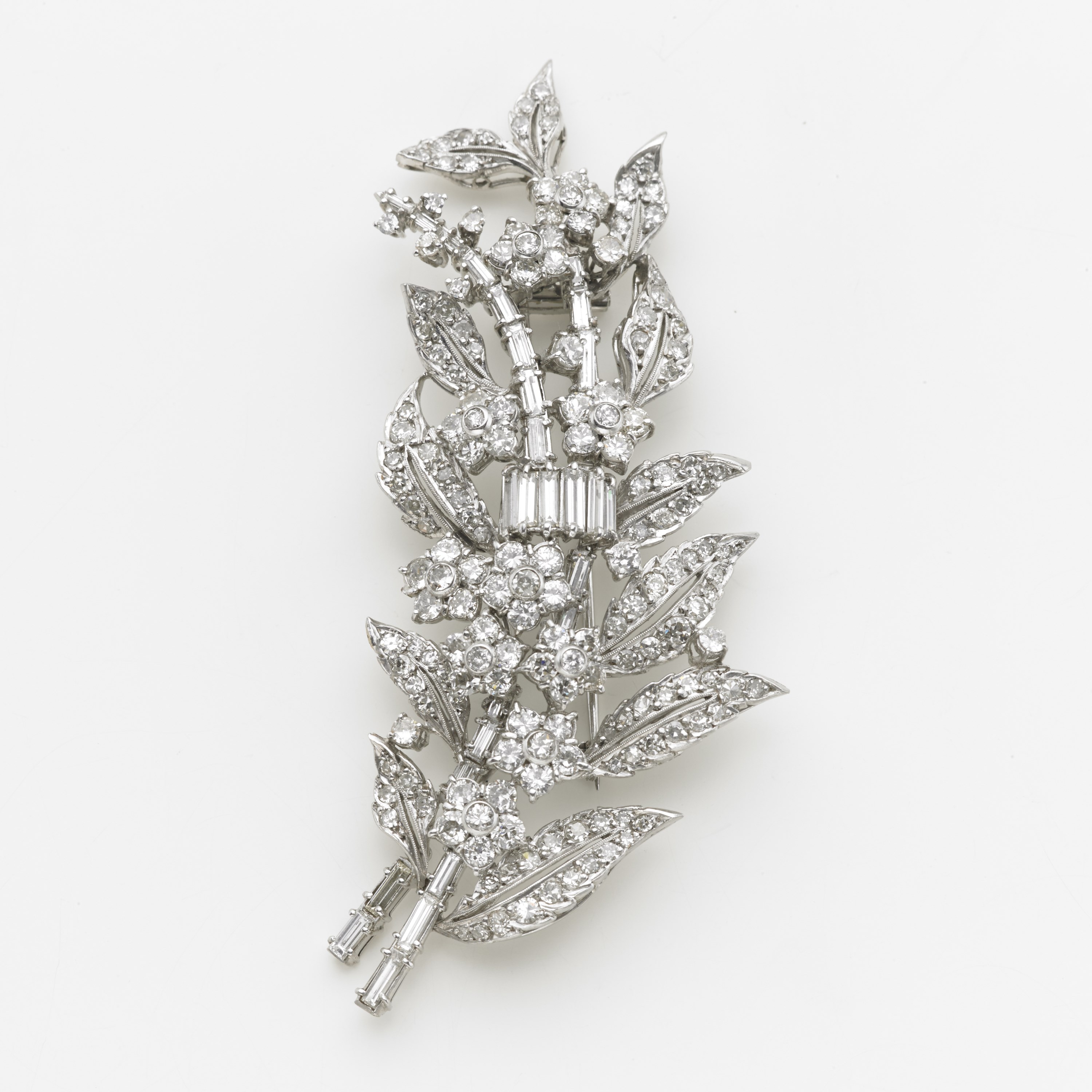 Spilla in oro bianco e diamanti a motivo floreale anni 50/60, i diamanti rotondi e baguette g.37,80 Floral white gold and diamond ring
