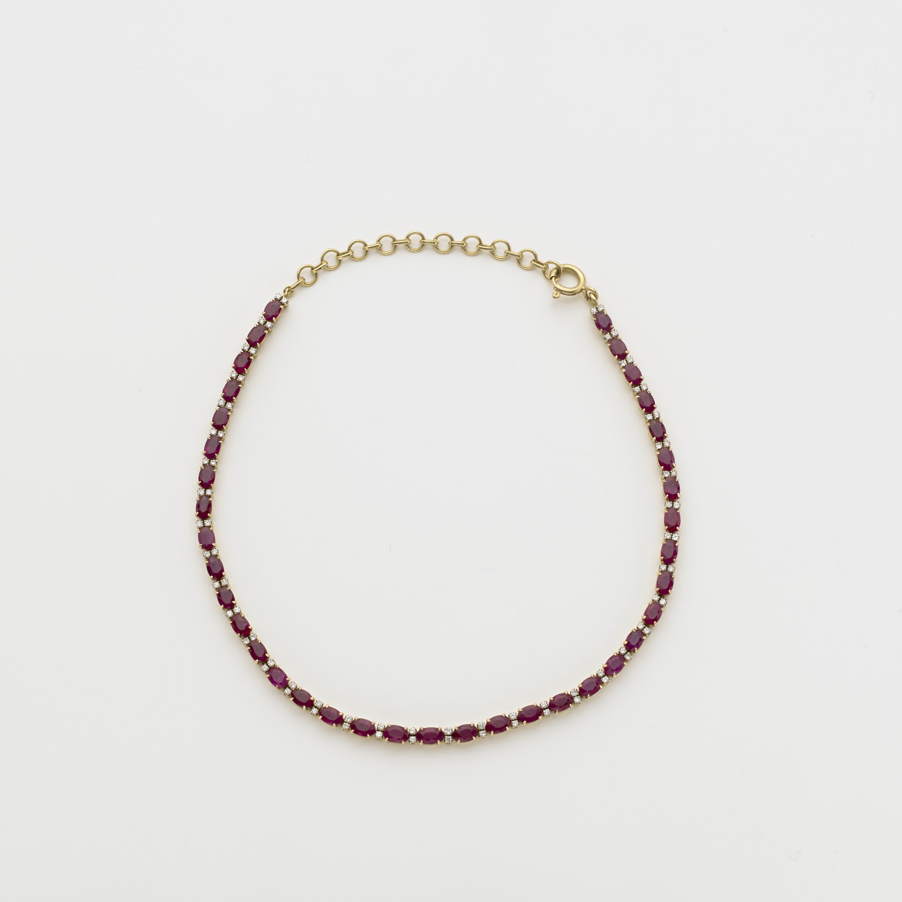 Collier de chien in oro giallo con 37 rubini ovali taglio composito per complessivi ct 25 circa e piccoli diamanti a distanziarli tra loro per complessivi ct 1,50 circa g.33,00, lungh. da cm 32 a cm 39,5 Ruby neckchoke with diamond spacers