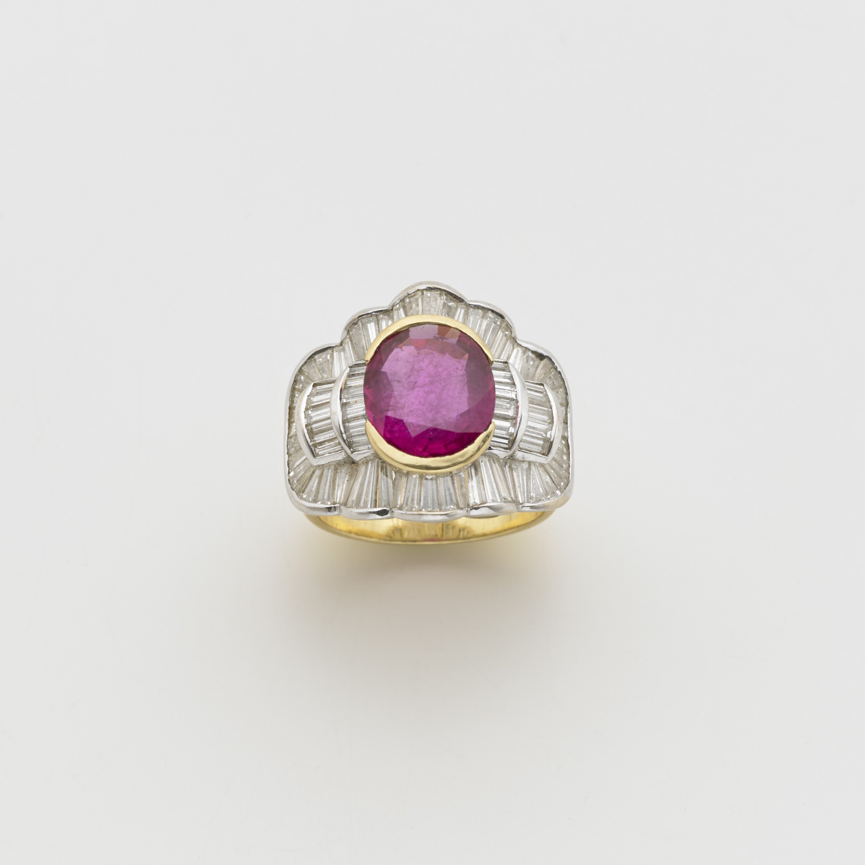 Anello in oro bianco e giallo con rubino ovale ct.4,65 circa e diamanti...