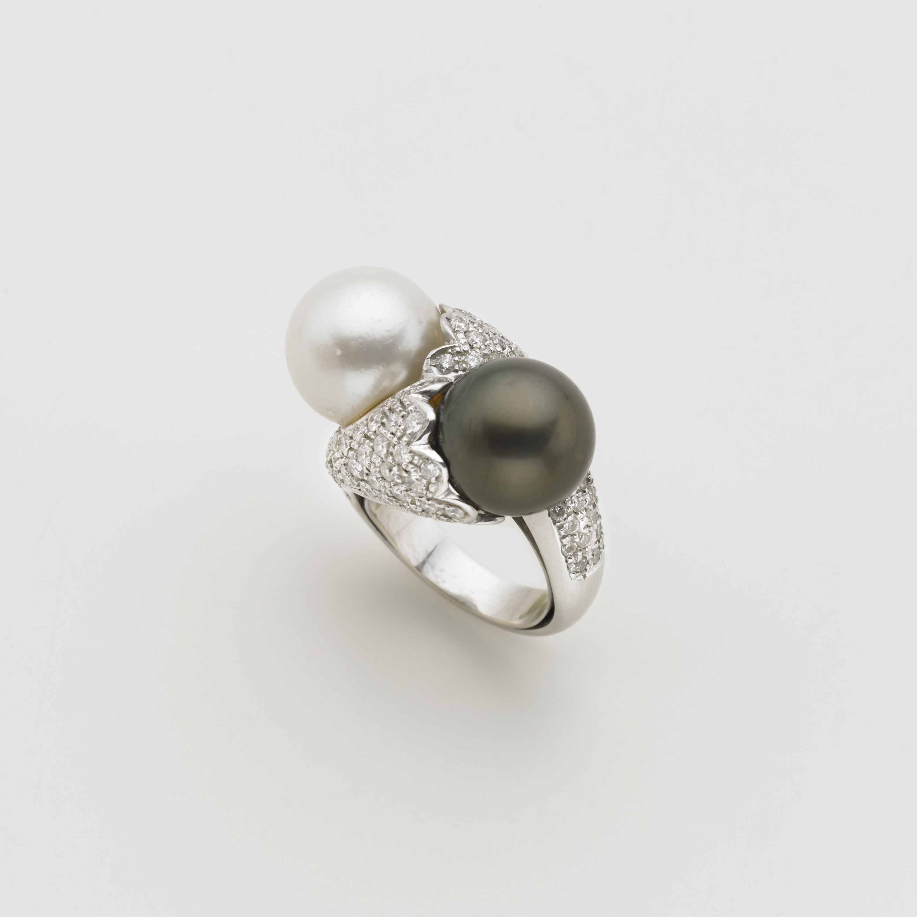 Anello in oro bianco a contrariÈ con pave di diamanti rotondi una perle coltivata south sea bianca di mm 12,60 circa e una perla coltivata Taithi nera di mm 12,30 circa g. 17,90 misura 14/54, con contranello Cultured pearl, diamond and white gold cross-over ring, with reducer