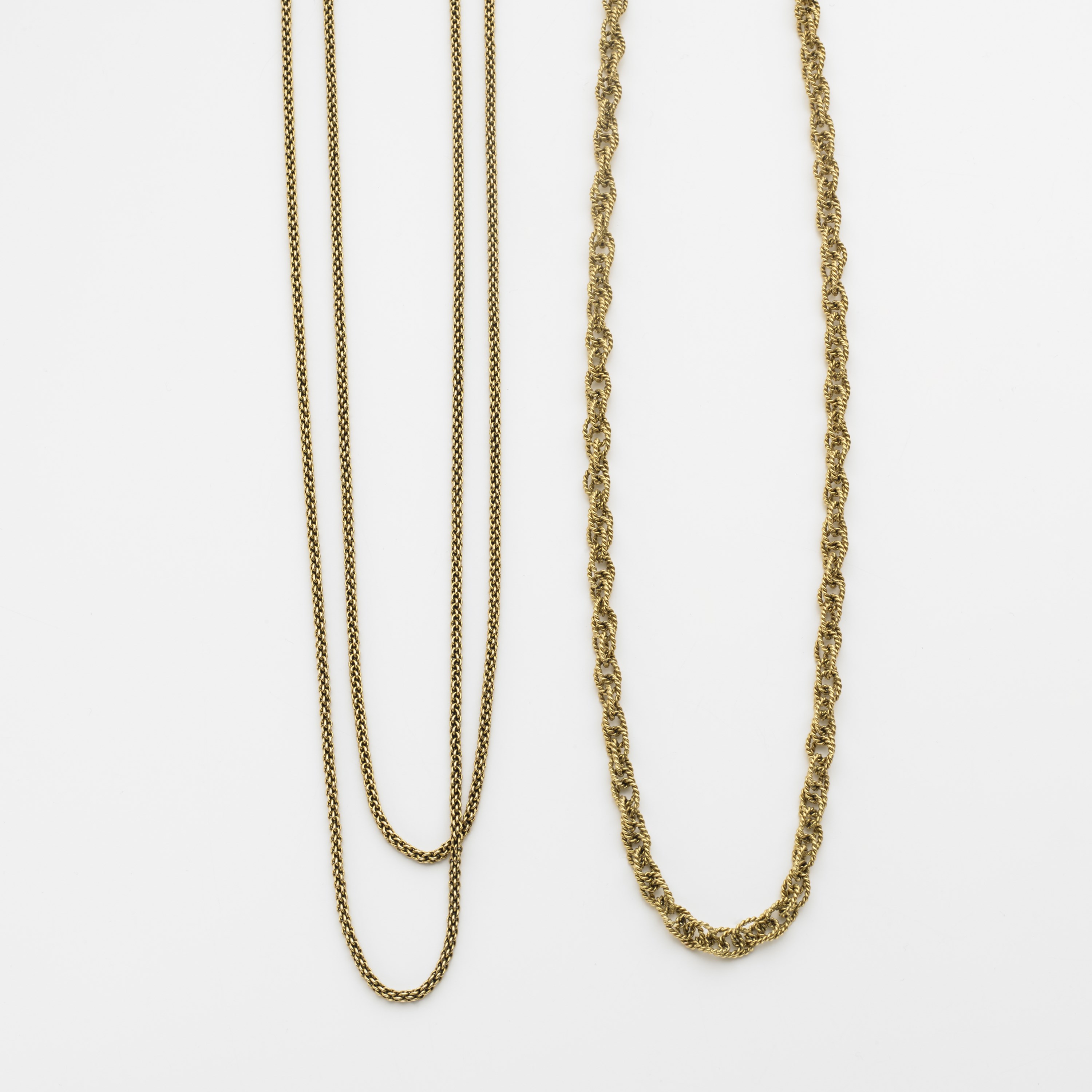 Due catene lunghe in oro giallo e rosso una lungh. cm 82 e l'altra cm 218 circa complessivi g. 157,10 Two bi-coloured gold link chains