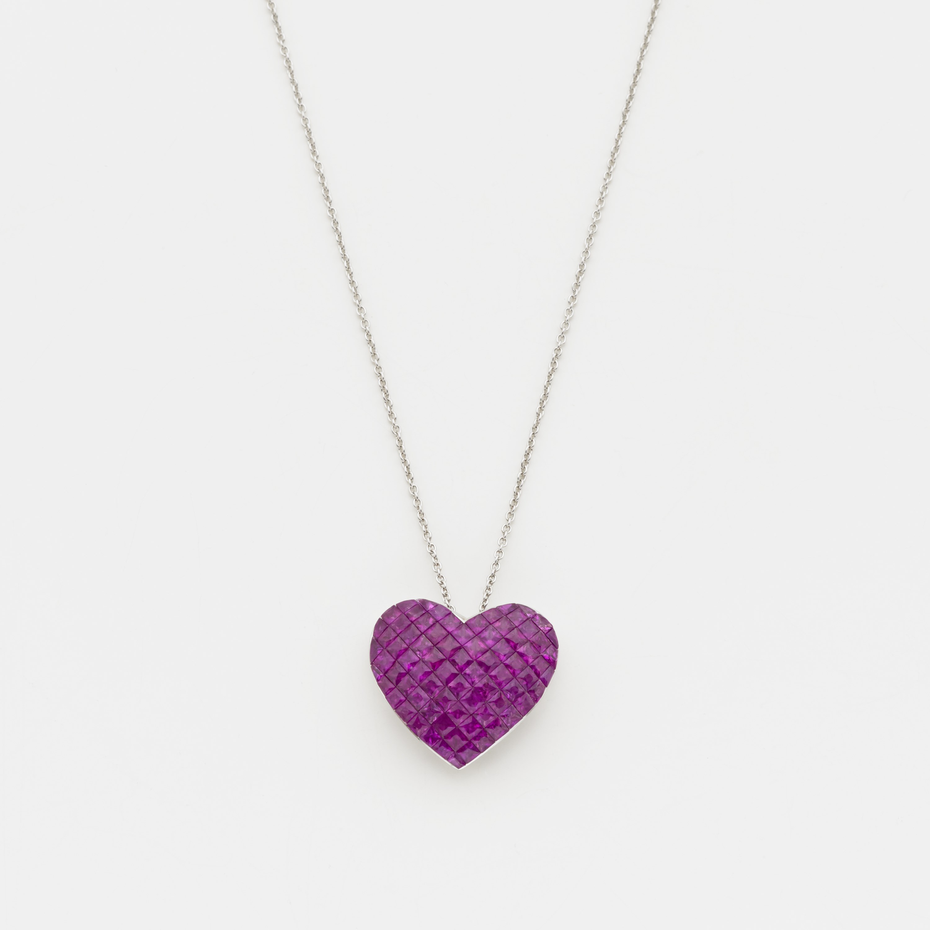Catenina con pendente a guisa di cuore tutto in oro bianco, rubini carrÈ invisible set per ct 3,70 circa g. 6,50 White gold chain with invisible set ruby heart pendant