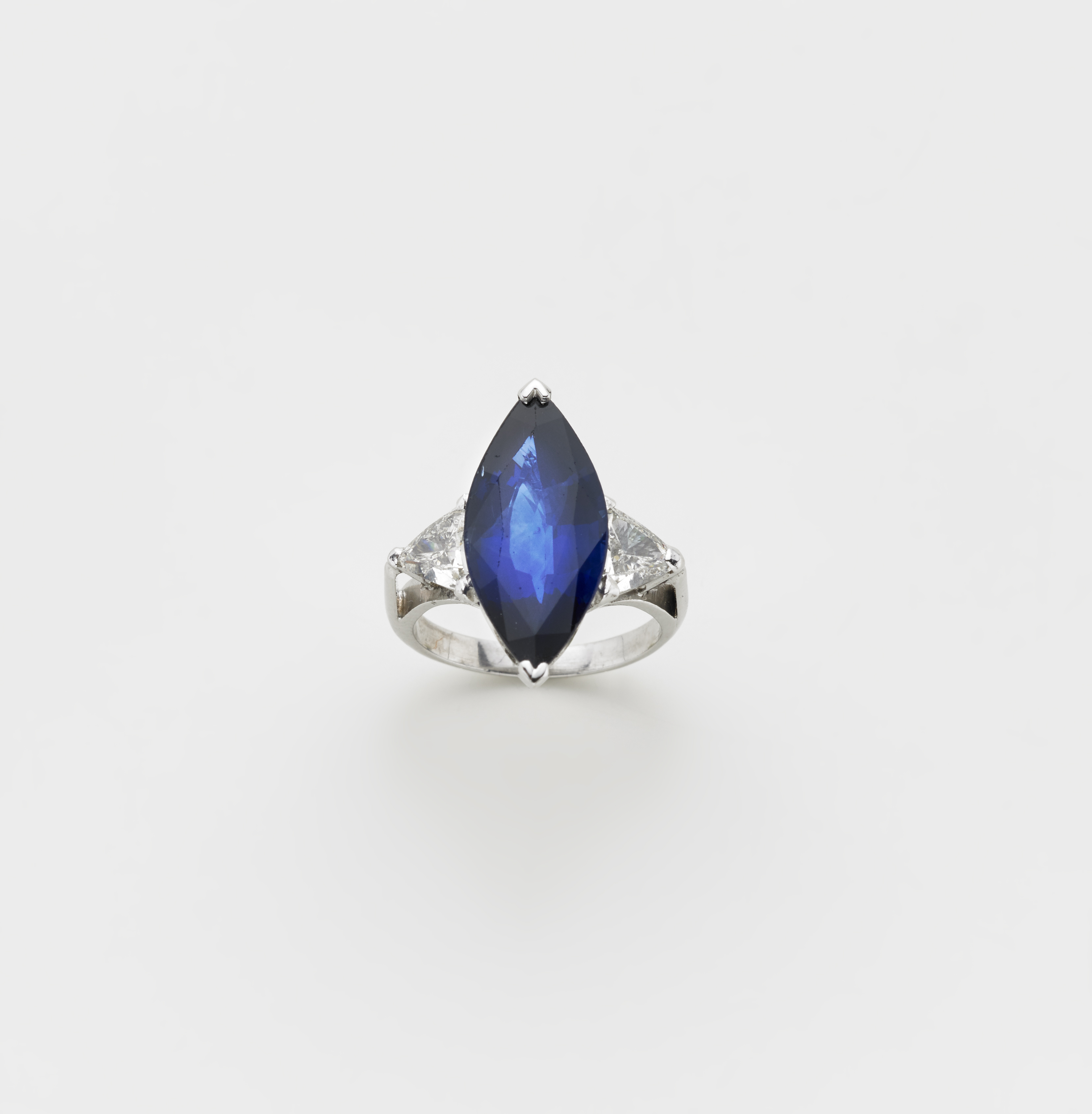 Anello in oro bianco con due diamanti triangolari ai lati di uno zaffiro a navette di ct. 7,70 circa, g. 6,20, misura 8/48. Sapphire single stone white gold ring with diamond shoulders