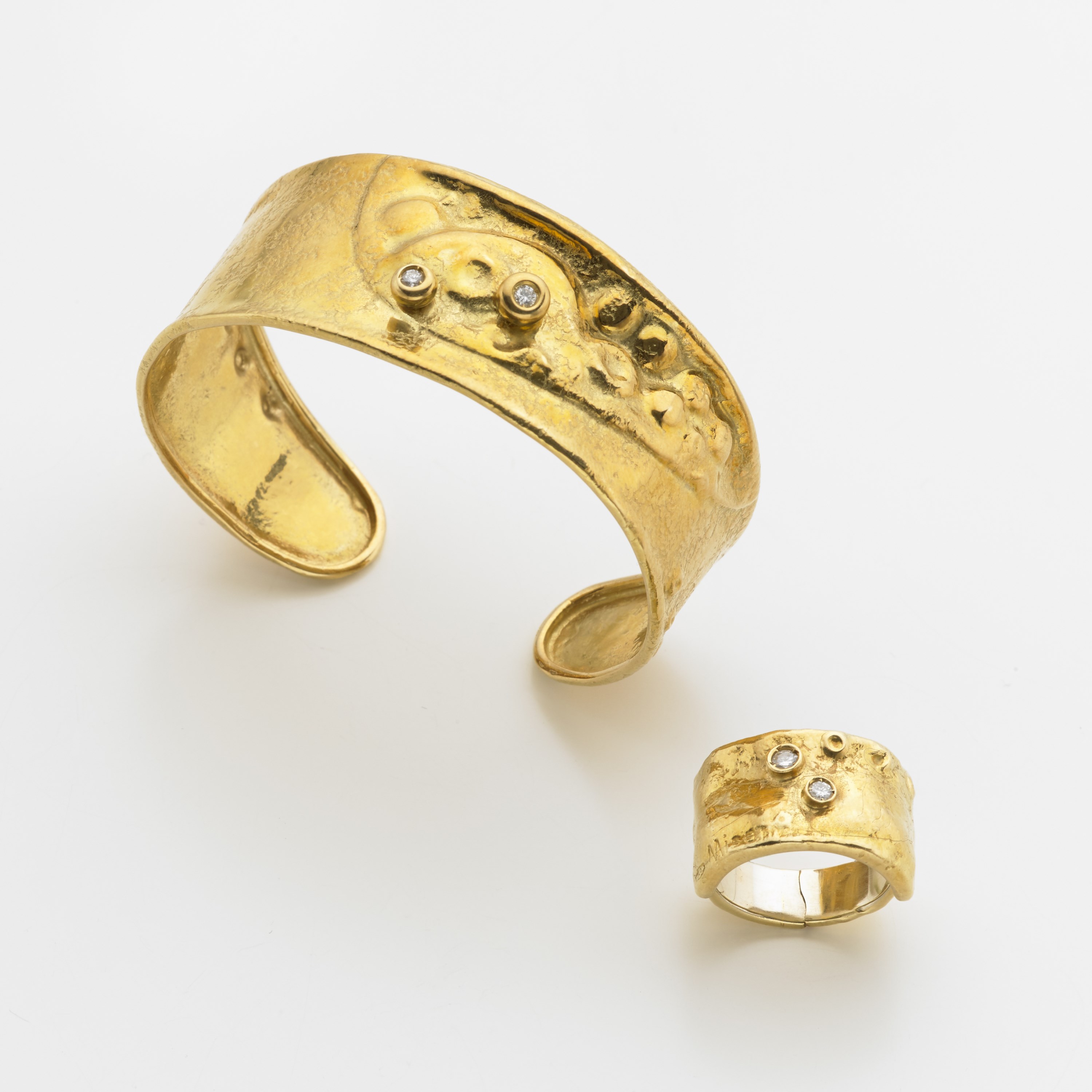 MISANI Demi-parure in oro giallo bracciale rigido alla schiava ed anello entrambi con diamanti g. 26,10 misura anello 15/55 (aperto sotto) Diamond and gold set of jewellery comprising a cuff bracelet and a a band ring