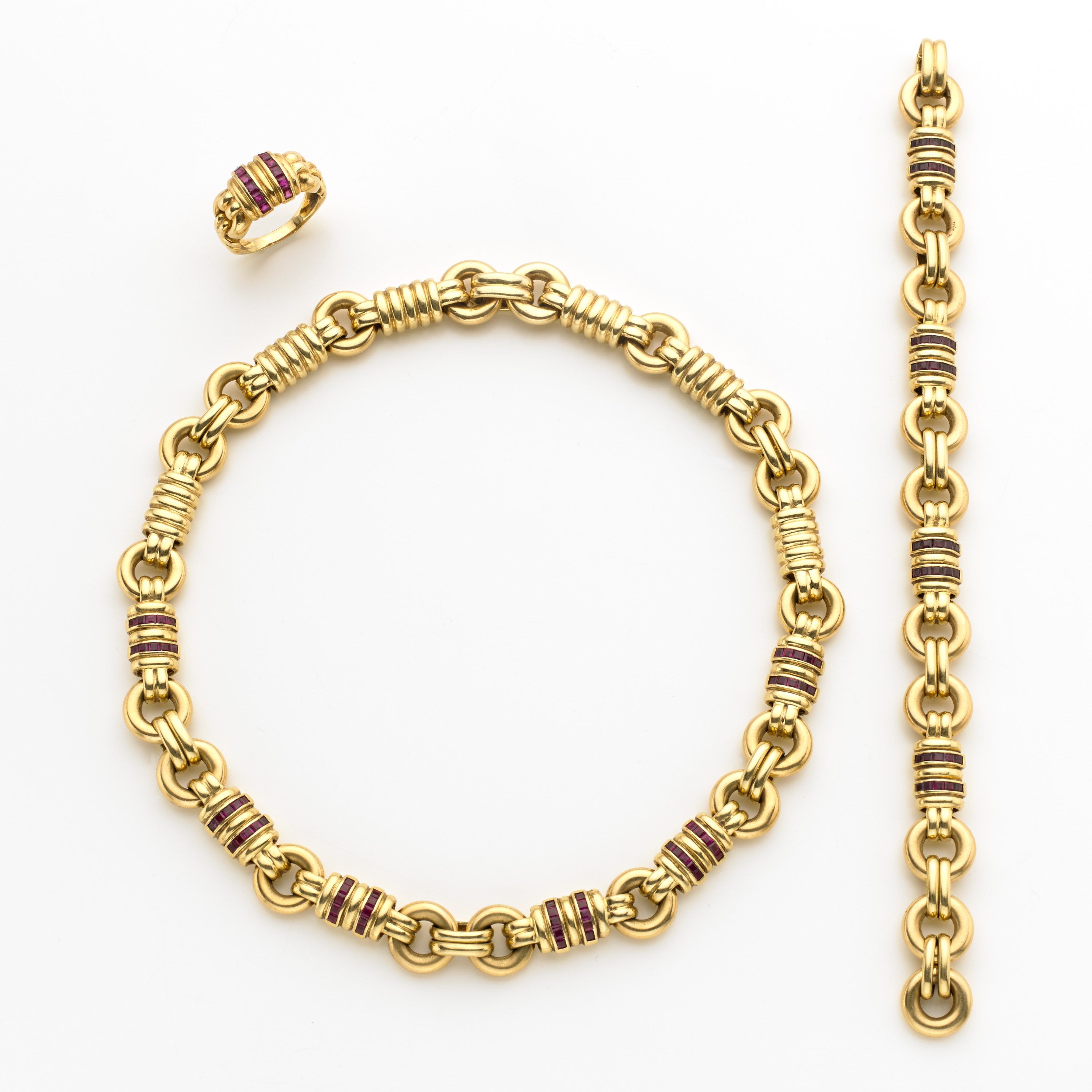 FARAONE Demi-parure in oro giallo collier bracciale ed anello a maglie con rubini carrÈ. Collier lungh. cm 43, bracciale lungh. cm 21 anello misura 21/61, complessivi g. 155,50 Gold and ruby set of jewellery comprising a necklace and a ring
