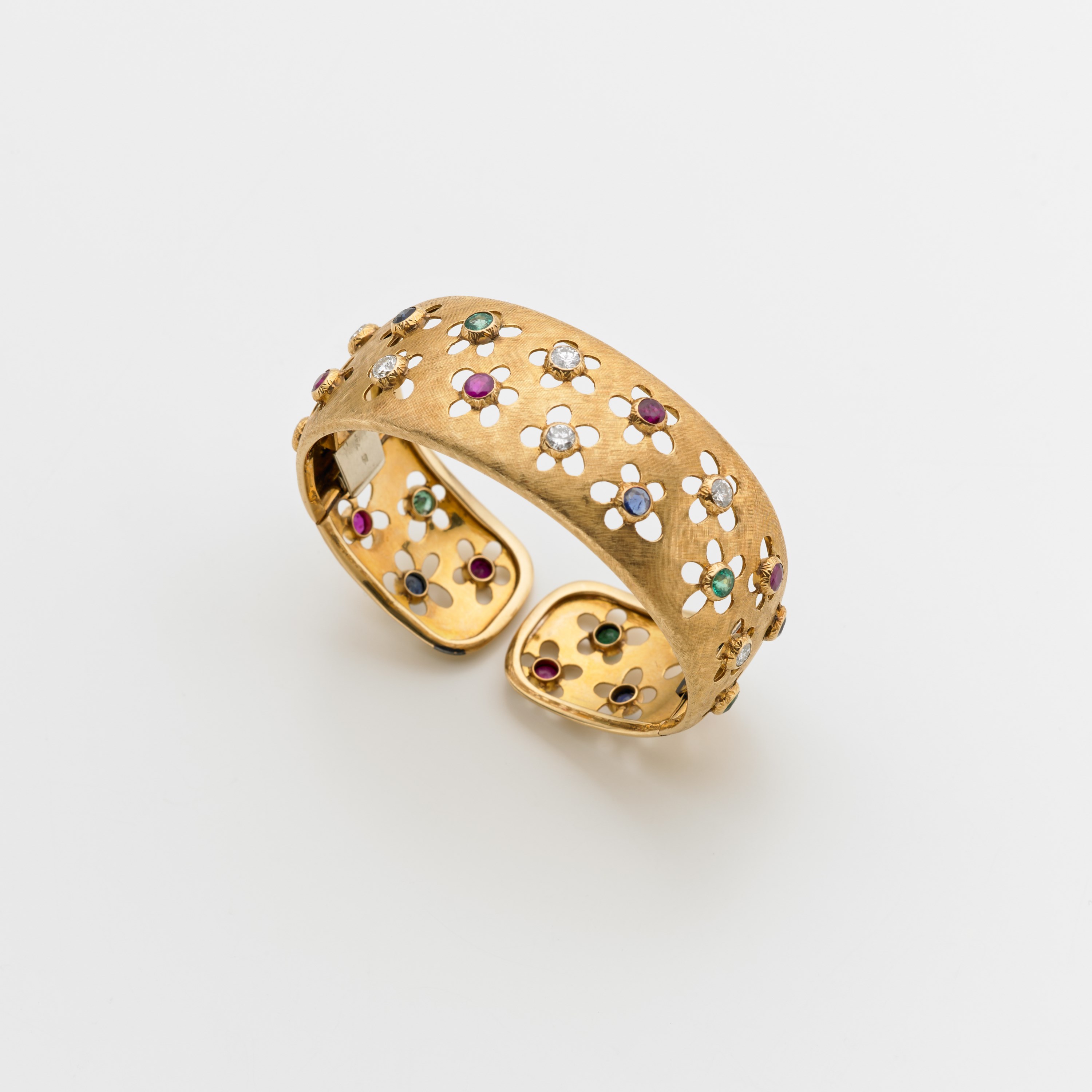 Bracciale rigido alla schiava in oro giallo satinato con due aperture a scatto, otto rubini, sei zaffiri, sei smeraldi e sei diamanti tutti rotondi, g. 45,7 Sapphire, emerald, ruby and diamond gold cuff bracelet