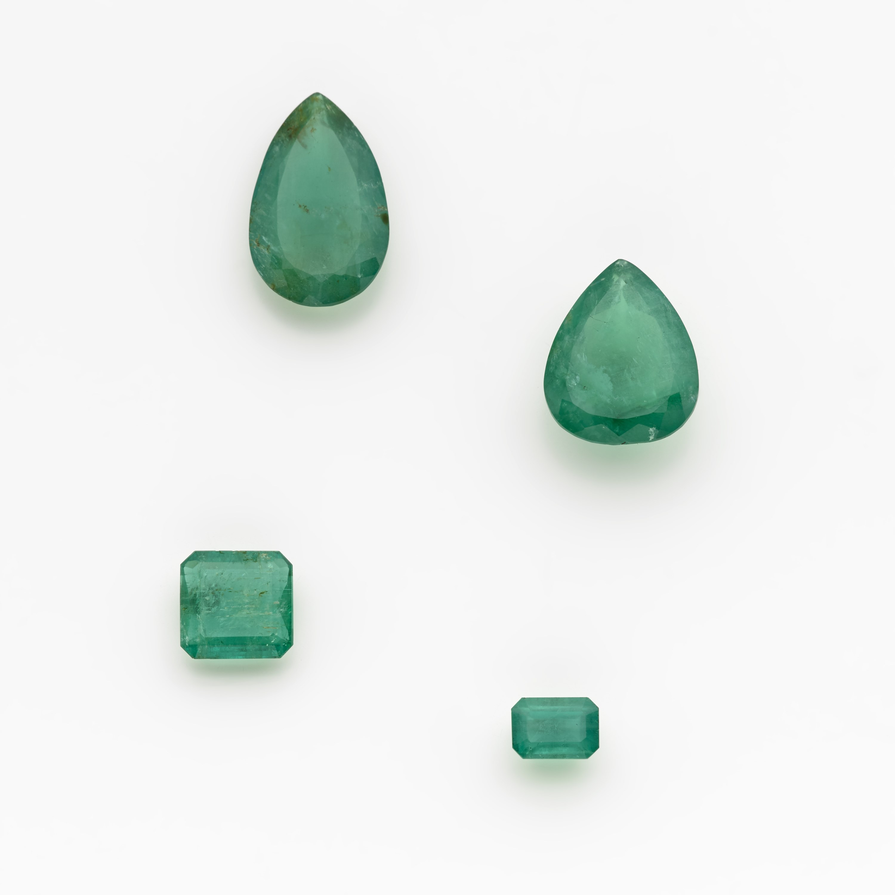 Lotto composto da quattro smeraldi due a goccia rispettivamente di ct 24,50 e ct 20,68, e due ottagonali rispettivamente di ct 9,66 e 4,84 Lot comprising four emeralds; two pear shaped two octagonal