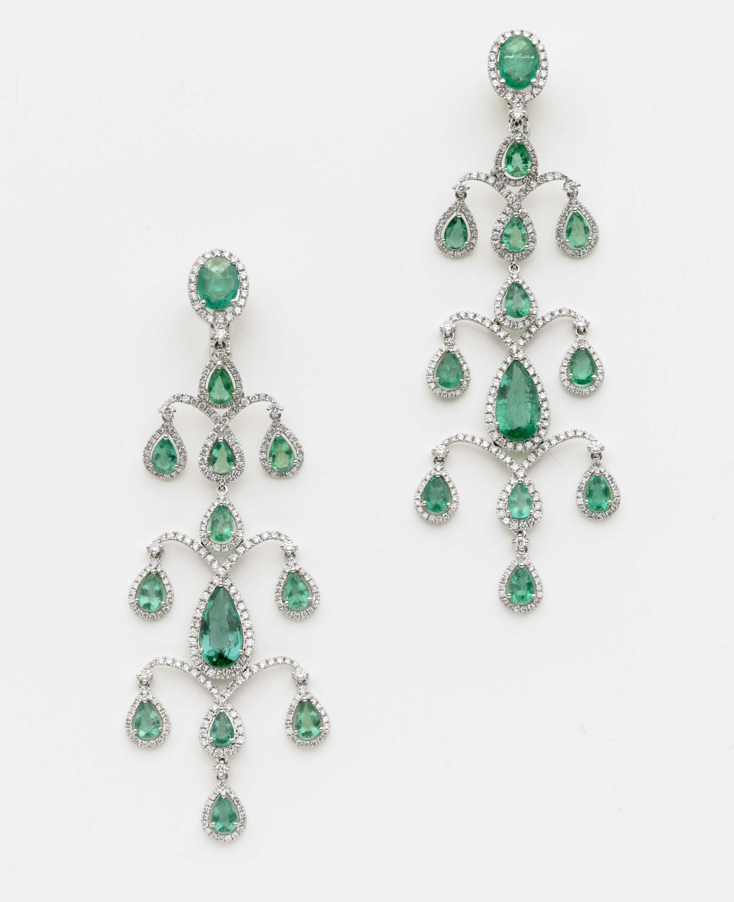 Orecchini pendenti con perno e clips in oro bianco con diamanti rotondi e goccia a incorniciare e rifinire quattro smeraldi a goccia per complessivi ct 10 circa g. 11,70 Emerald and diamond white gold ear pendants