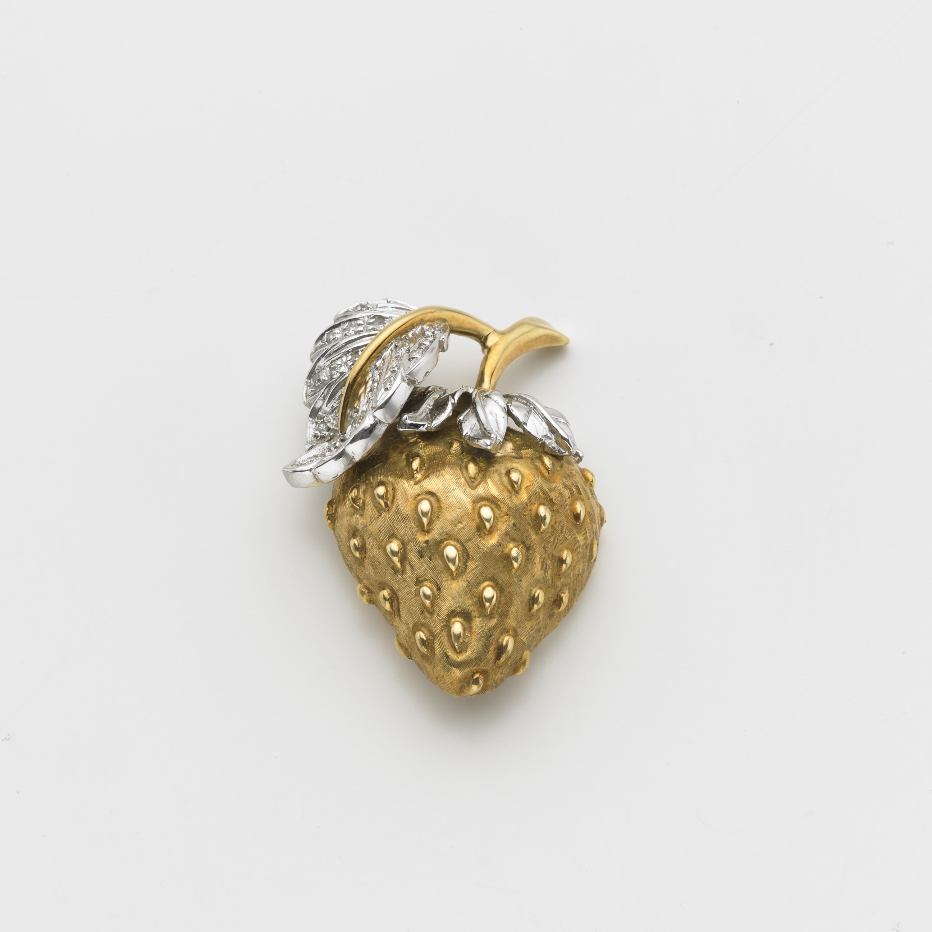 Broche a guisa di fragola in oro giallo e bianco, lucido e satinato con...