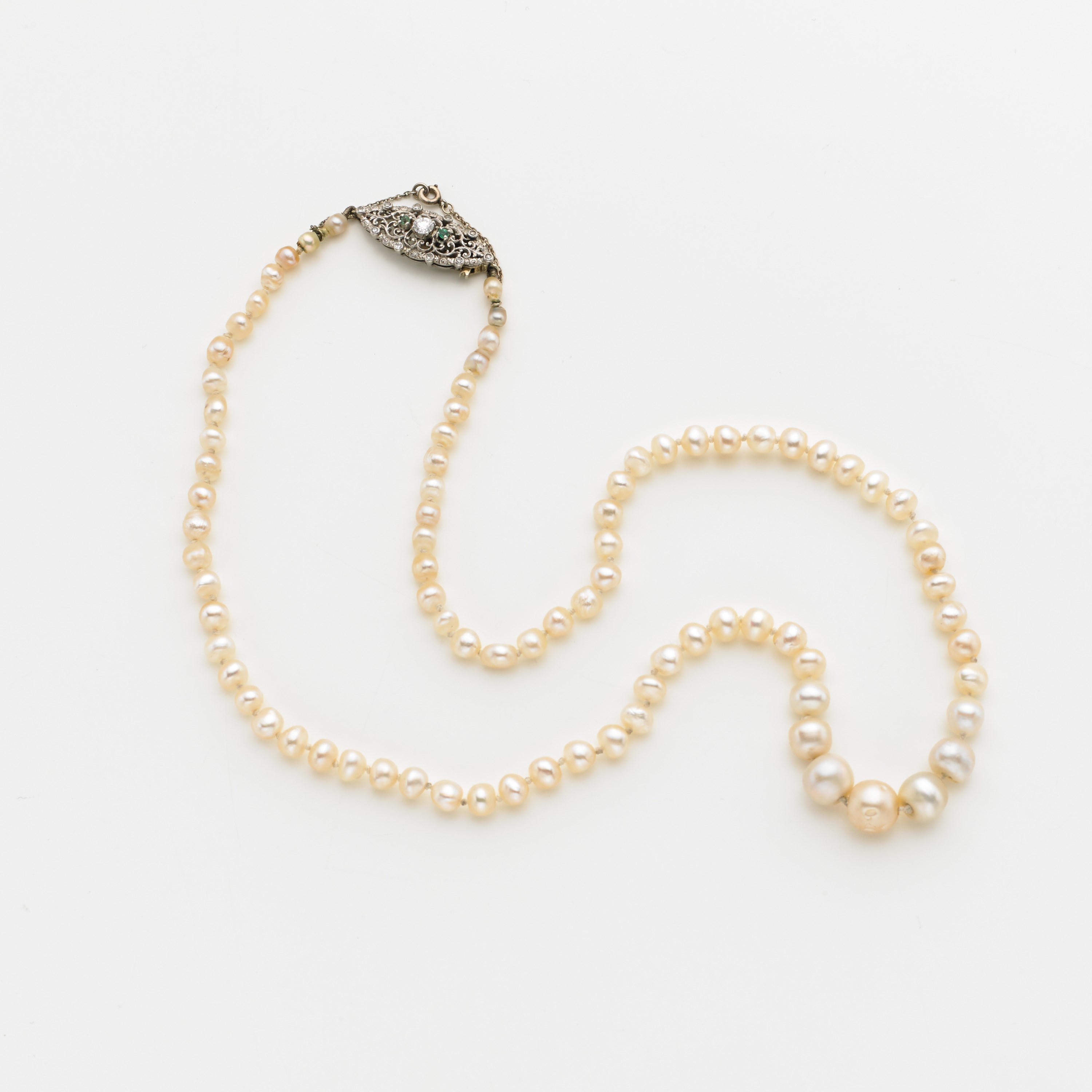 Collana di 85 perle naturali da bianco a cream degradate da mm 3/3,50 a mm 8,50/9 di acqua salata con chiusura in oro bianco con due piccoli smeraldi e diamanti a contornarne uno centrale lungh. cm 50 complessivi g. 22,00 Accompagnato da report di analisi gemmologica CISGEM n. 2305 Milano 14/12/2015 Single strand graduated natural pearl necklace white to cream. Emerald and diamond white gold clasp Appended CISGEM analysis