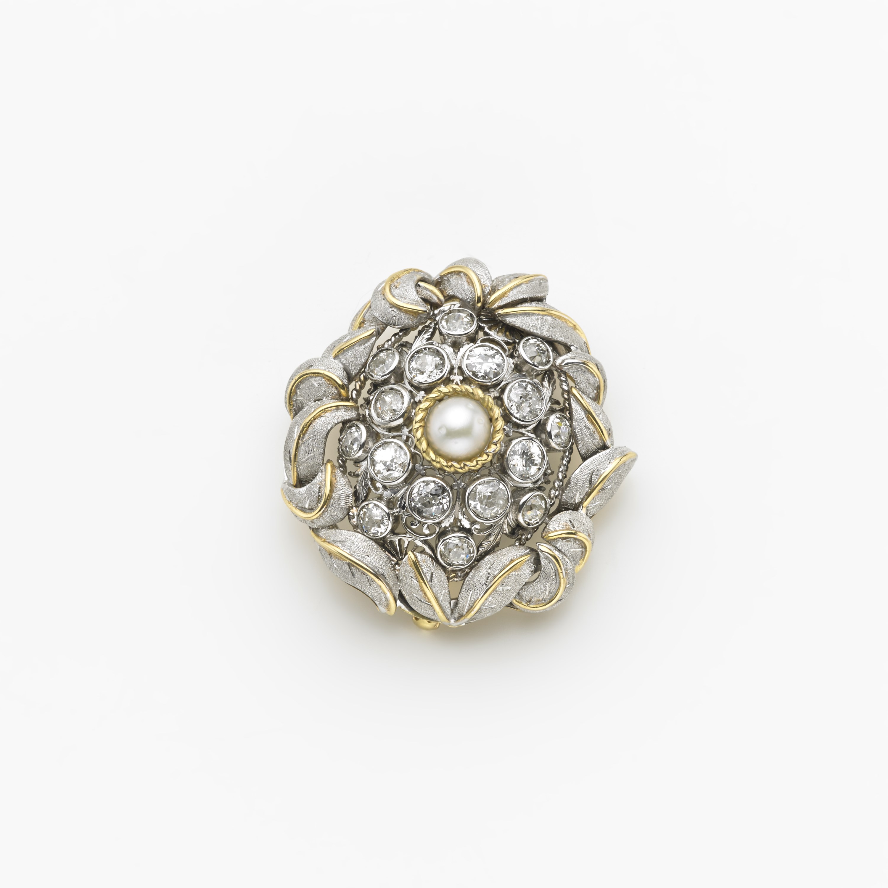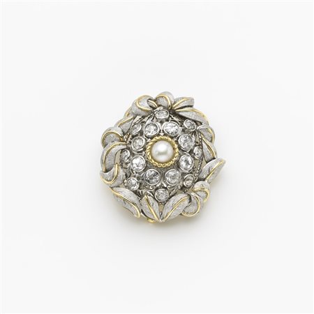 Spilla in oro giallo e bianco con foglie lucide e satinate a contornarediamanti rotondi taglio a brillante vecchio europeo per circa ct 2 ed al centro una perla coltivata bianca g. 20,70 cm 4 circa Bi-coloured gold brooch with diamonds and centered by a pearl