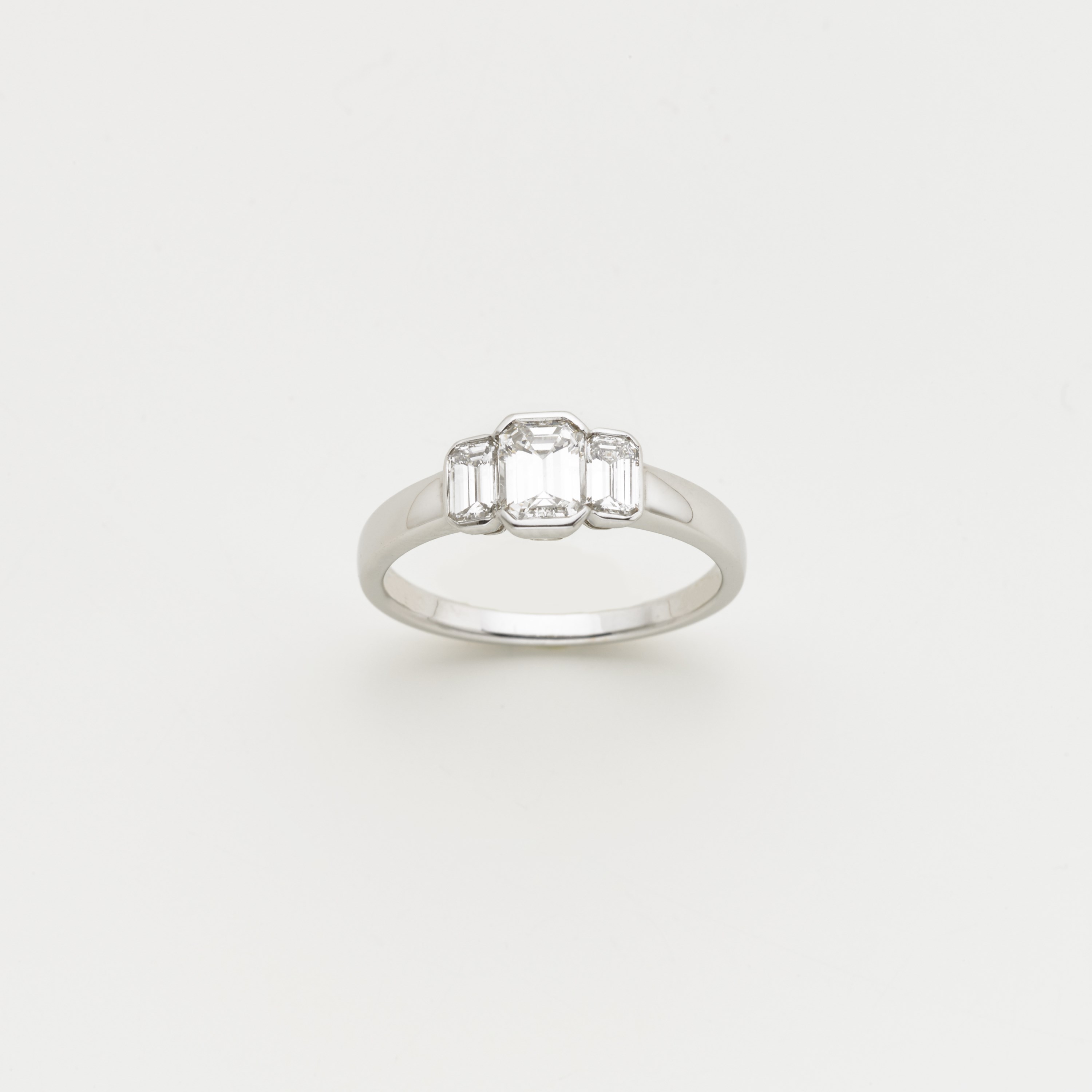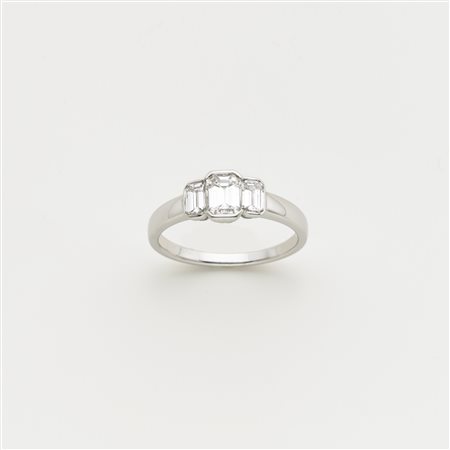 Anello in oro bianco con tre diamanti ottagonali taglio a gradini, centrale...