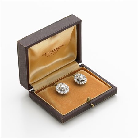 CALDERONI MILANO Orecchini a lobo in oro bianco con perno in oro giallo a guisa di fiore con al centro due diamanti rotondi taglio a brillante vecchio europeo, per ct 1,30 circa complessivi, ognuno contornato da quindici diamanti rotondi g. 6,30. Con scatola originale Bi-coloured gold diamond cluster earings with original case