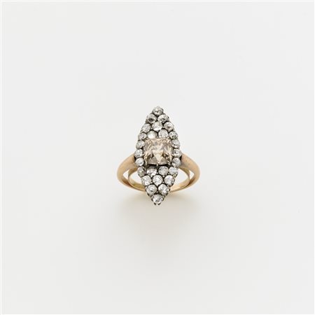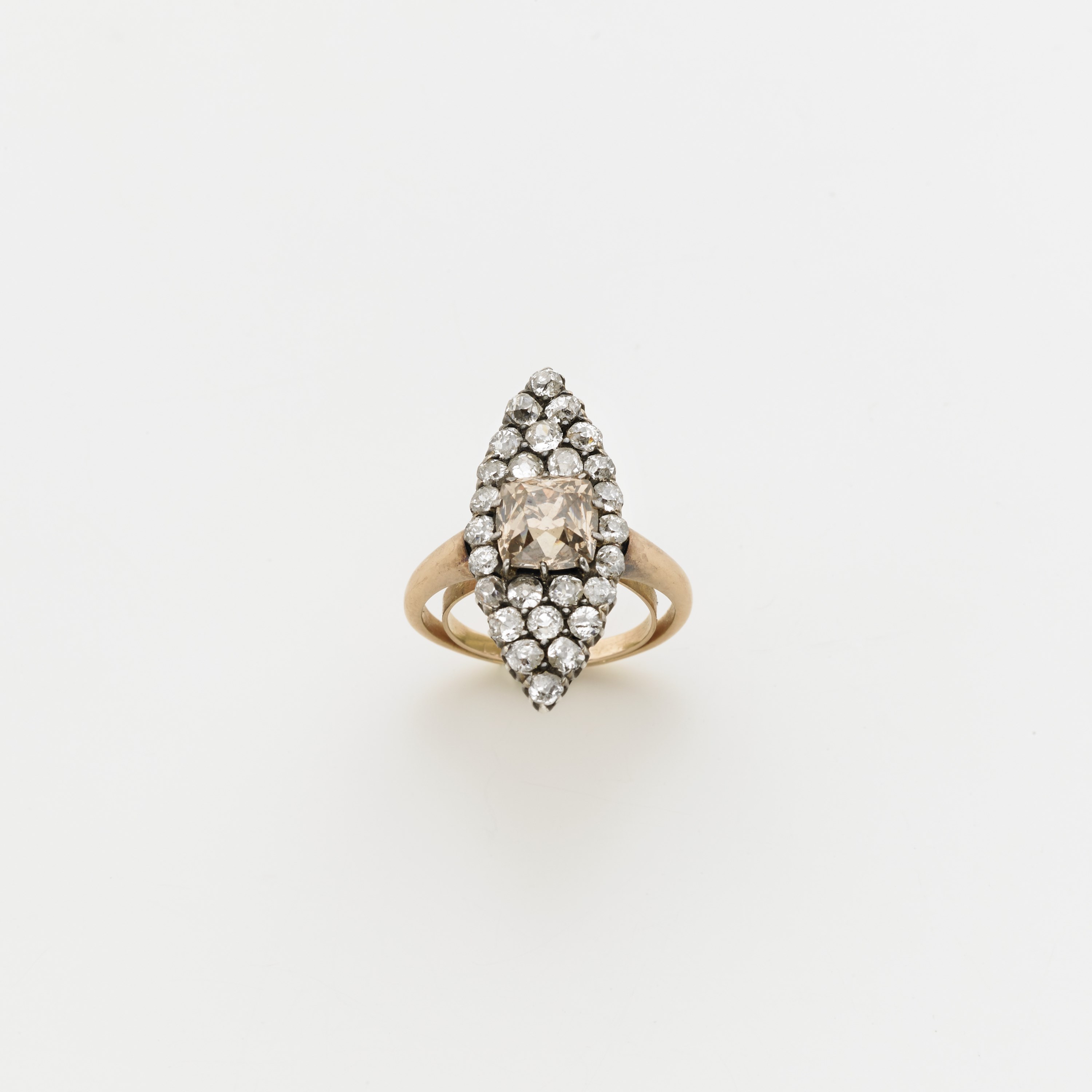 Anello in oro rosso e argento con diamanti rotondi taglio old mine per ct 1,80 circa ed un centrale di forma a cuscino taglio old mine di ct 2 circa. Il diamante centrale Ë un fancy light orangy brown, g. 5,60 misura 15/55, con contranello interno Accompagnato da analisi gemmologica GECI n. 1014212 Milano del 09/12/2015 Red gold and silver diamond ring. The central diamond being a fancy light orangy brown, with ring reducer. Appended GECI certificate