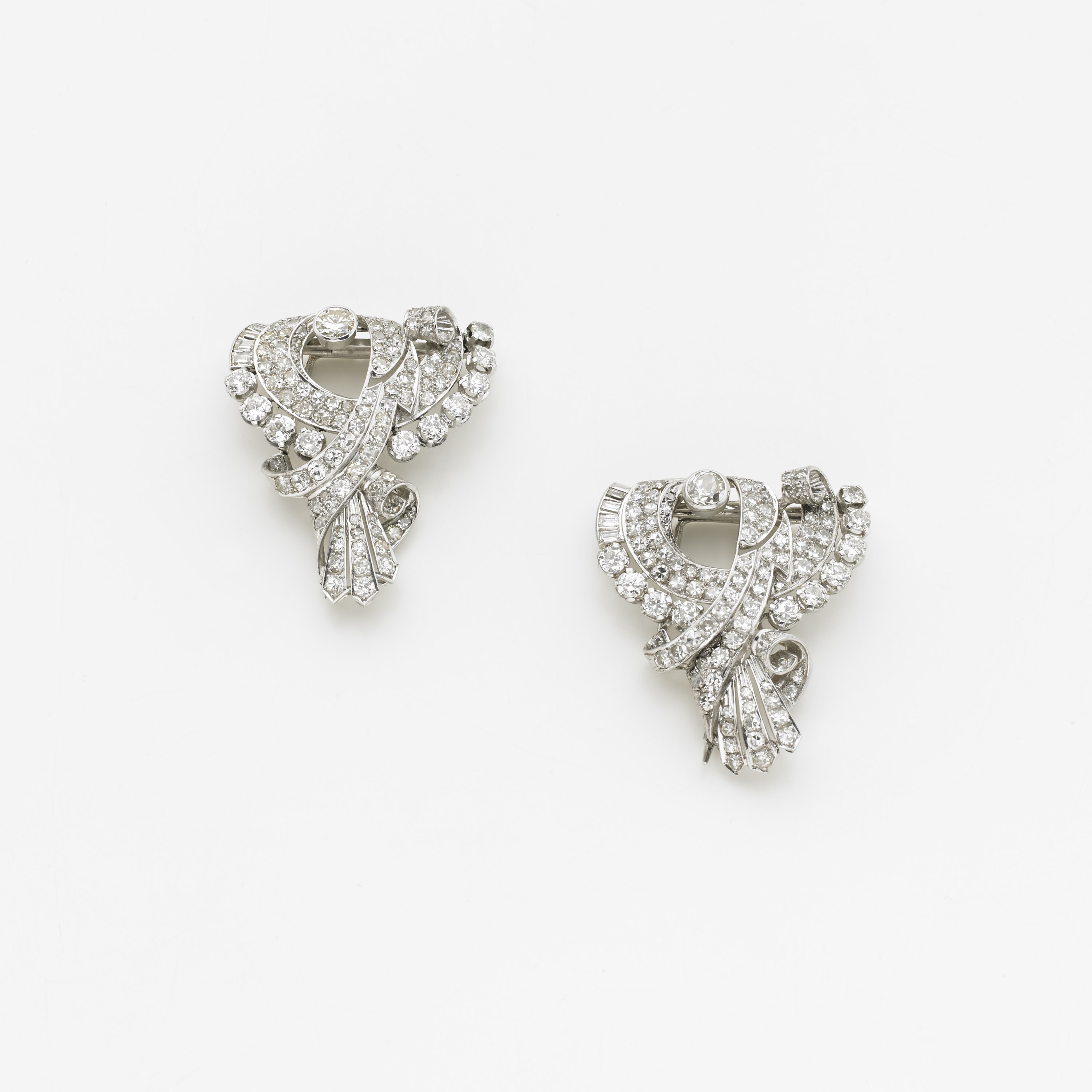 Coppia di broches in oro bianco e diamanti, i due diamnti centrali di ct 0,50...