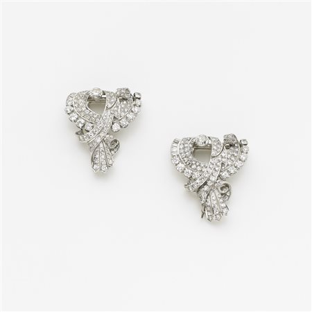 Coppia di broches in oro bianco e diamanti, i due diamnti centrali di ct 0,50 l'uno, g.33,80 Two white gold diamond brooches