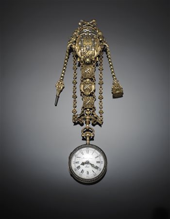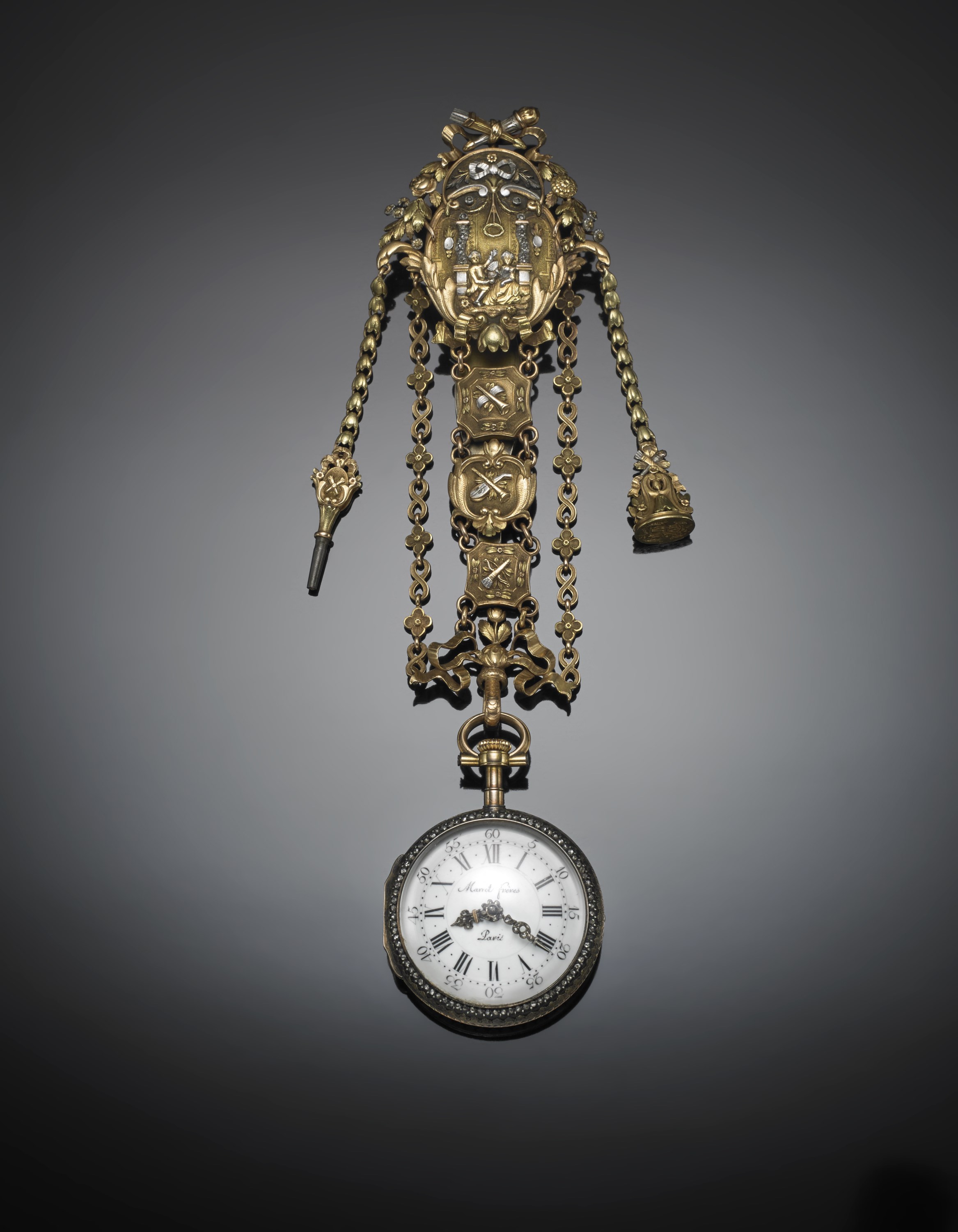 MARRET FRERES Chatelaine con orologio, in oro e platino, rifinita con diamanti anche nelle lancette dell'orologio, chiave originale e timbro. Nei bassorilievi immagini musicali, a ricordare momenti di corte a Palais Royal e "l'allegoria dell'amore passionale" nell'icona incrociata di fiaccola e faretra, g. 114,50 complessivi, l. 18 cm circa. Henry Vever, dedica a la maison Marret FrËres, ben dieci pagine (355-364), dello storico trattato "La Bijouterie Francaise au XIX∞ Siecle" Troisieme Republique 1870-1900, edito nel 1908. Cita: "Les Marret ont toujours fait de la belle joiallerie (...) Un grand nombre d'ËlËves habiles se formËrent dans leur atelier, tels que: Boucheron (...) En 1855, la maison obtenait une mÈdaille d'honneur, la plus haute rÈcompense accordÈ ‡ cette Èpoque." Platinum, gold and diamond chatelaine with watch, original key and stamp Henry Vever dedicates ten pages of his historical treaty to La Bijouterie Francaise au XIX∞ Siecle" Troisieme Republique 1870-1900, stamped in 1908
