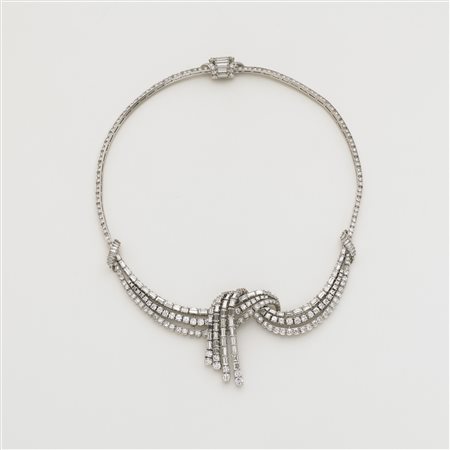 Lot 599 | Collier in platino con diamanti rotondi taglio a brillante, baguette e...