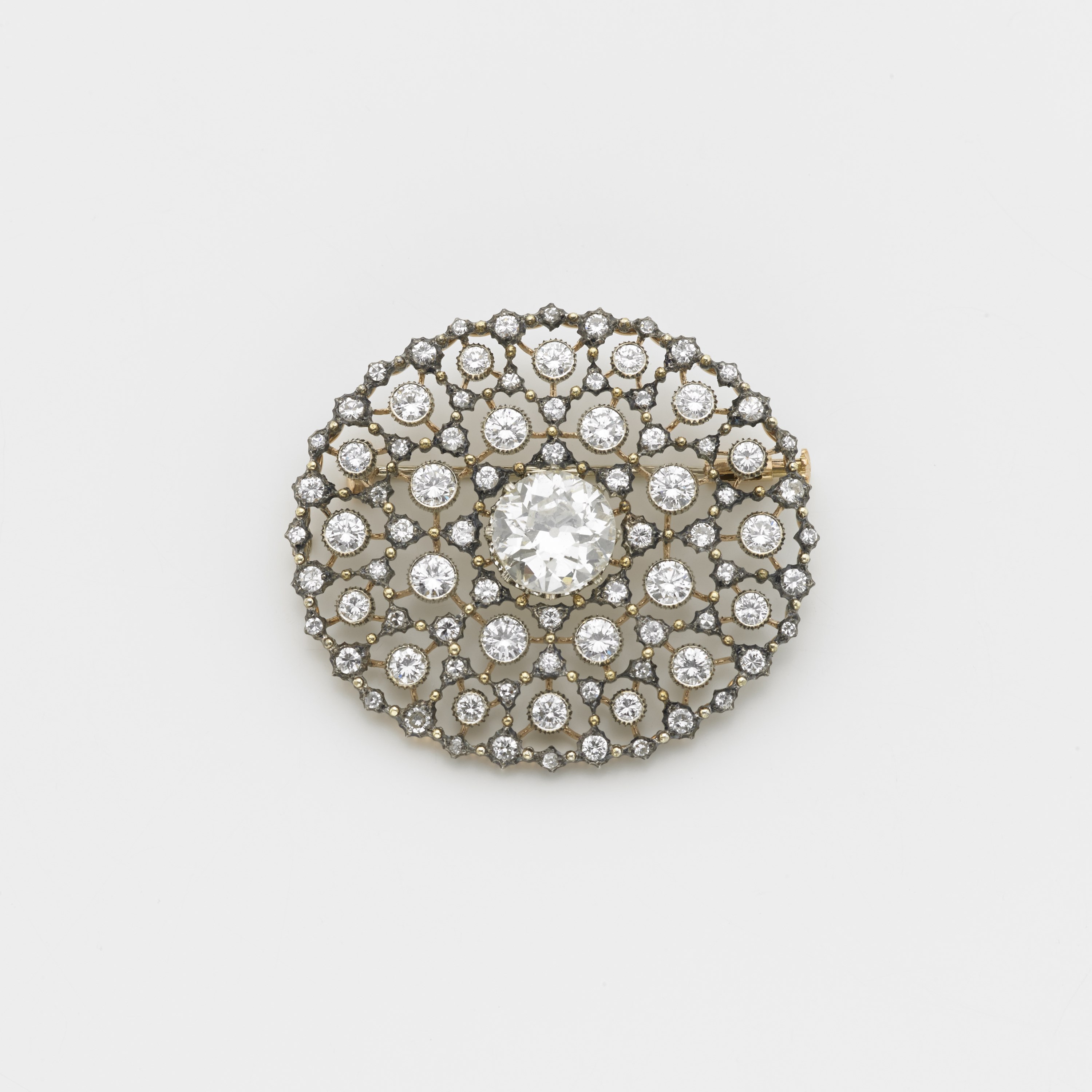 BUCCELLATI Spilla in oro rosso e argento di forma ovale con diamanti rotondi taglio a brillante di diverse dimensioni a contornare un diamante rotondo taglio a brillante vecchio europeo di ct 4,11, g. 11,70 Accompagnato da analisi gemmologica del CISGEM n. 2632IAAB del 16/02/2016 Milano Diamond red gold and silver brooch Appended CISGEM certificate