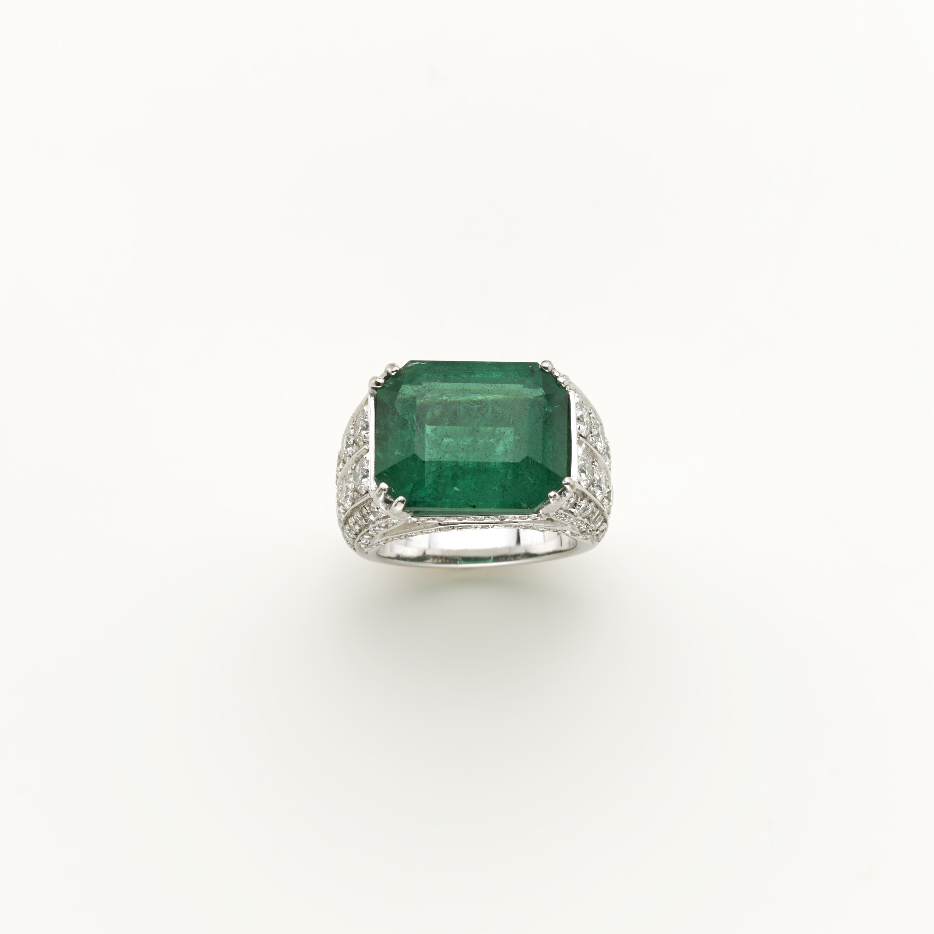 Anello in oro bianco con diamanti rotondi taglio a brillante per ct. 3,60 circa a tenere uno smeraldo ottagonale taglioa gradini di ct 15 circa g. 18,50 misura 16/56 Accompagnato da analisi gemmologica CISGEM numero 1846 Milano 12/10/215 White gold ring with diamonds and an emerald. Appended CISGEM jewel report