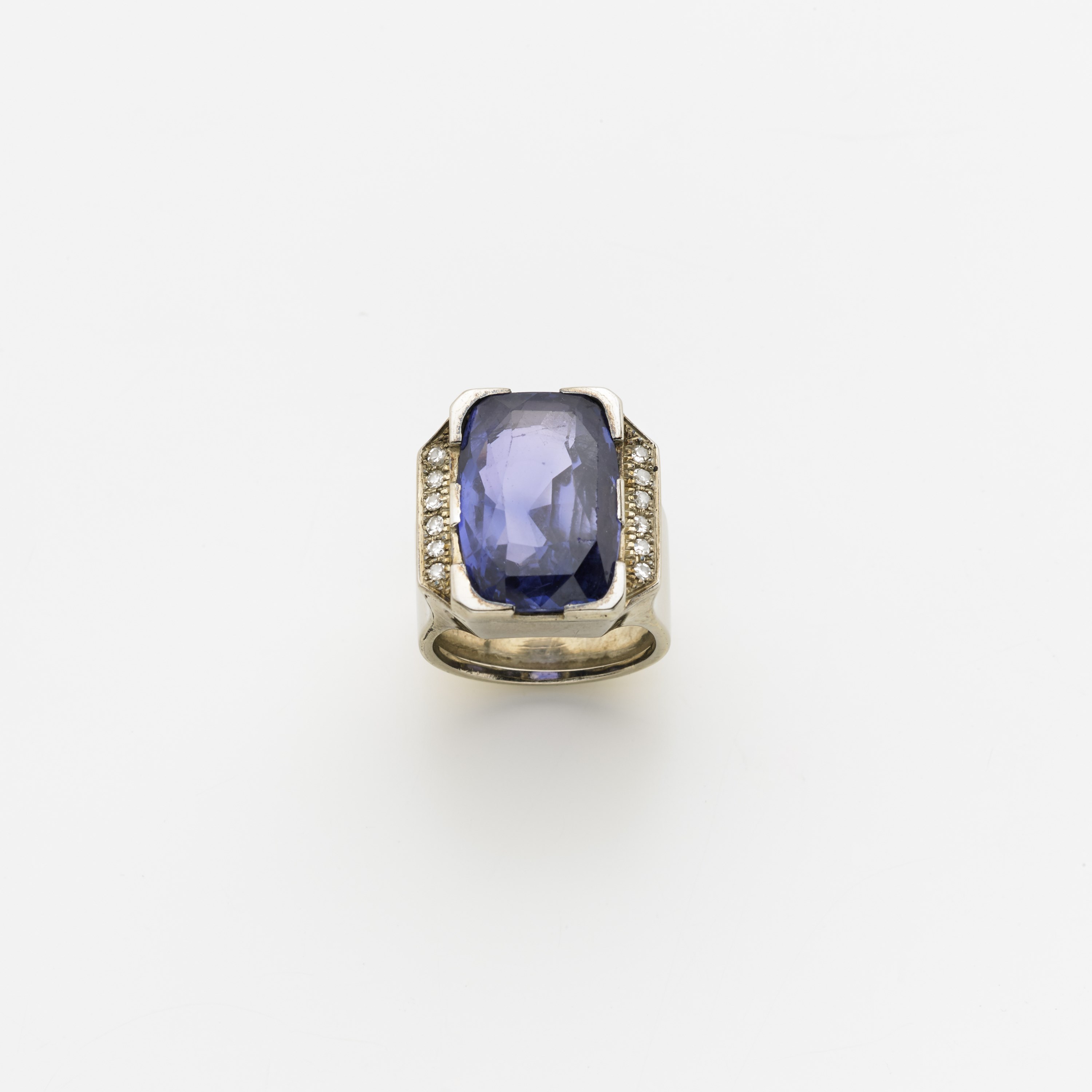 Lot 628 | Anello in oro bianco con piccoli diamanti rotondi ai lati di uno zaffiro...
