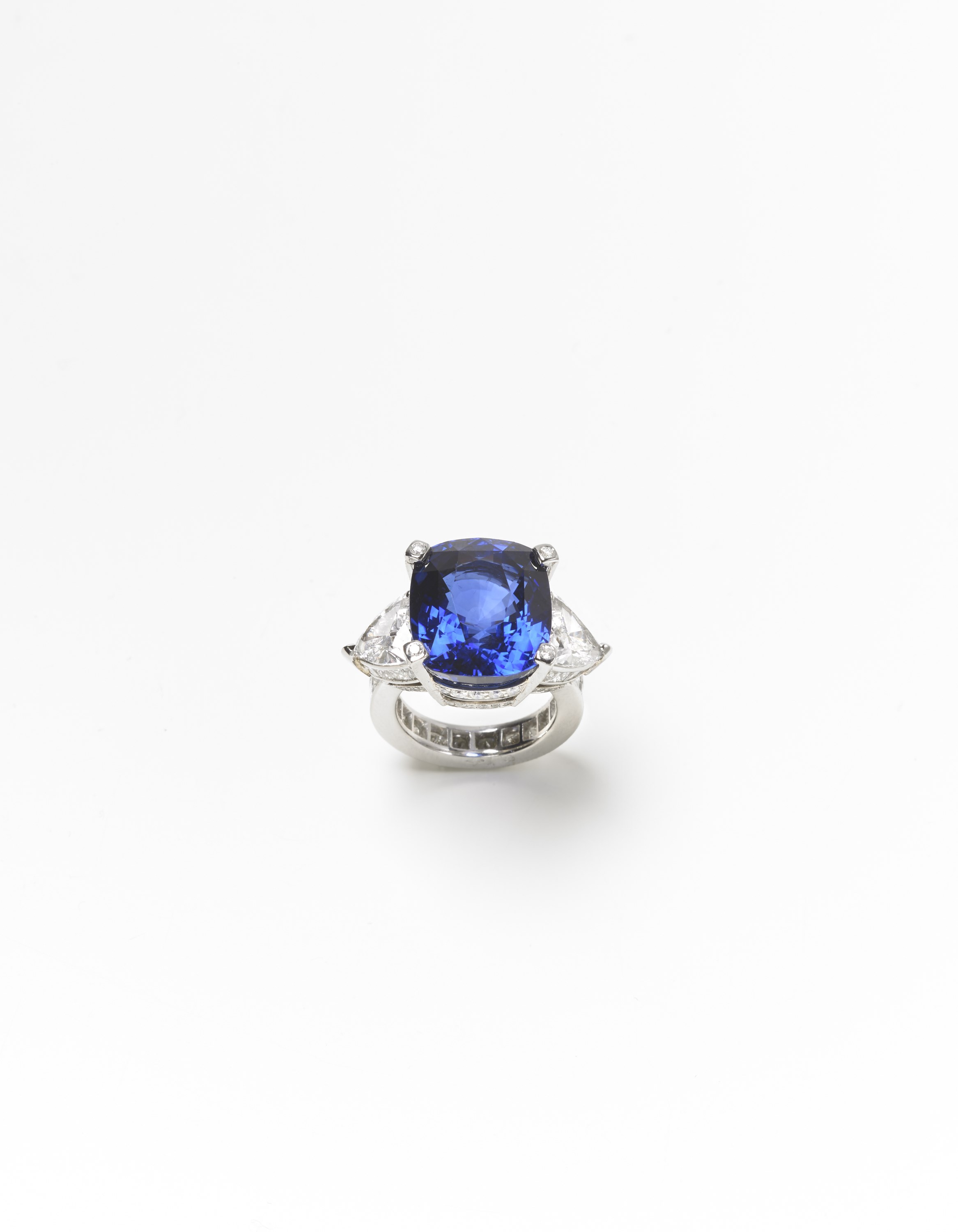 DUBAIL-PARIS Anello in oro bianco con diamanti carrÈ nel gambo e nei castoni come i diamanti rotondi a sostenere due diamanti triangolari di complessivi ct 3,10 circa, ai lati di uno zaffiro forma cuscino taglio composito di ct 26,03, g. 20,40 Accompagnato da certificato gemmologico GRS Gemresearch Swisslab n. GRS2016-02-7820 Lucerna 22/02/2016 DUBAIL-PARIS Sapphire and diamond white gold cluster ring Appended GRS Gemresearch Swisslab jewellery certificate