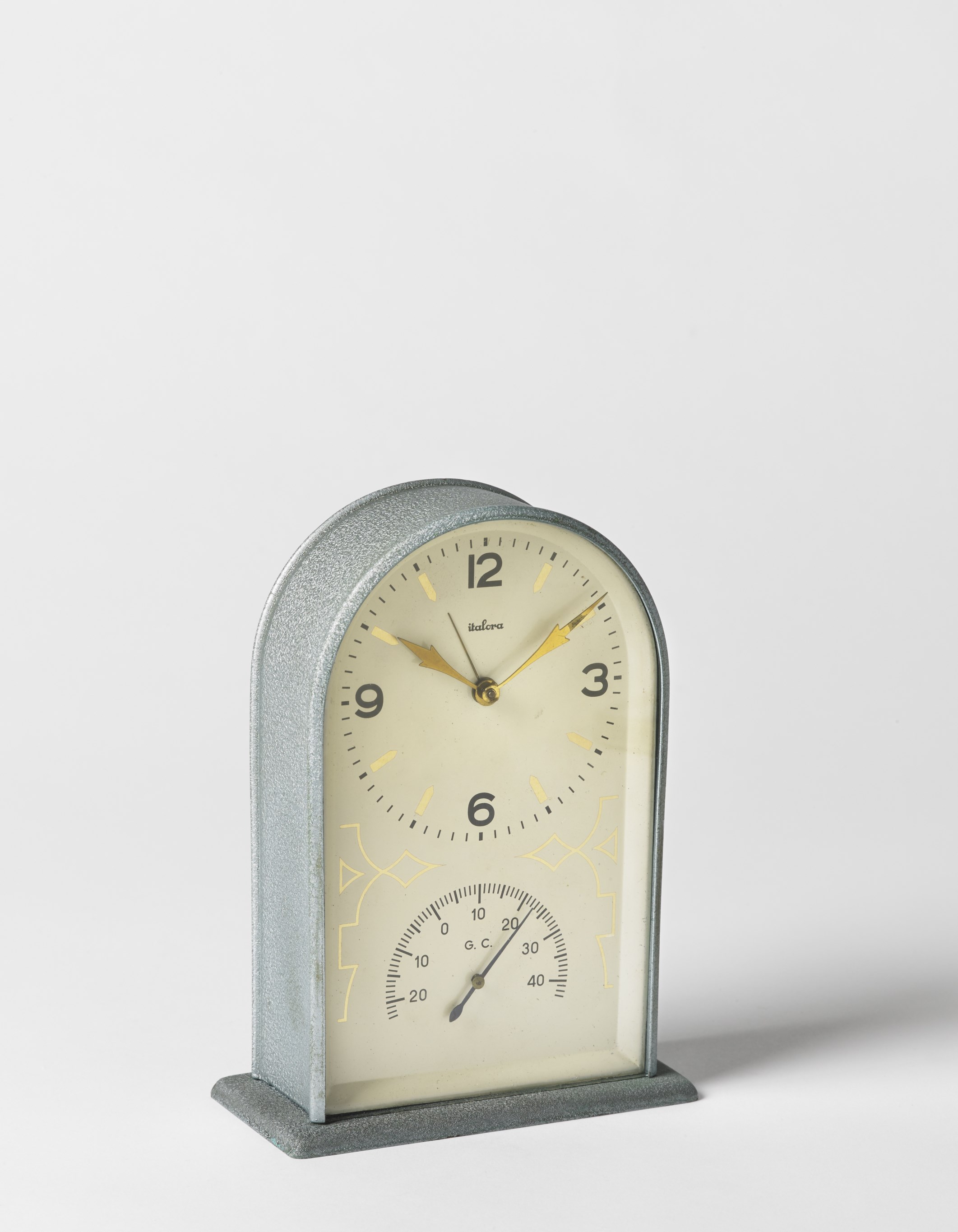 ITALORA Orologio salvadanaio in latta promosso da societ‡ assicurative o banche, in metallo verniciato color azzurro Anni '50 Quadrante, movimento e cassa firmati Movimento con carica manuale giornaliera, sveglia Quadrante color crema e decoro in oro, cifre arabe e indici ; a ore sei un quadrante con termometro Misura h cm 16 ITALORA Tin piggy bank clock 1950's Manual wind movement, alarm Cream dial with gold decoration