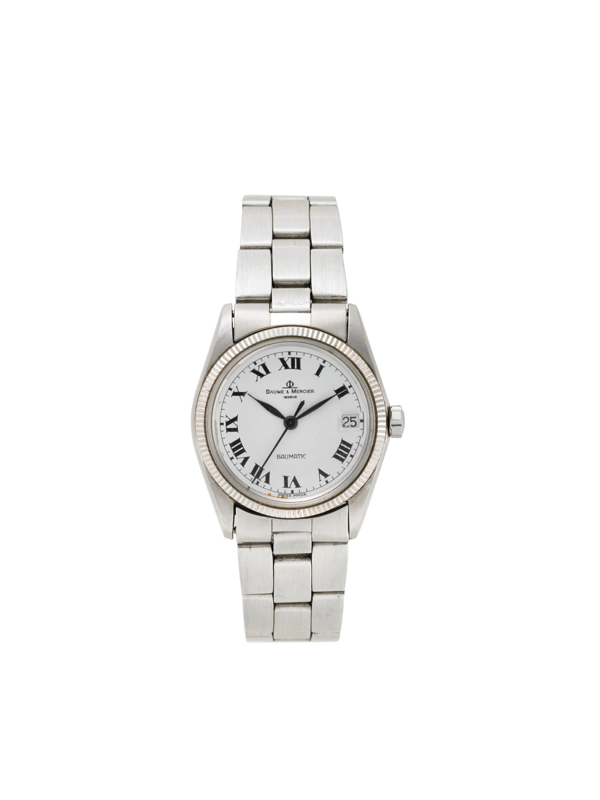 BAUME & MERCIER Orologio da polso da donna in acciaio completo di bracciale Epoca anni '70 Quadrante movimento e cassa firmati Movimento con carica automatica Quadrante bianco con cifre romane Cassa a vite n. 622909 1187-1 Gadget dell'Espresso Diam. mm 29 BAUME & MERCIER Lady's stailess steel wristwatch with bracelet 1970's Automatic wind White dial with Roman numerals