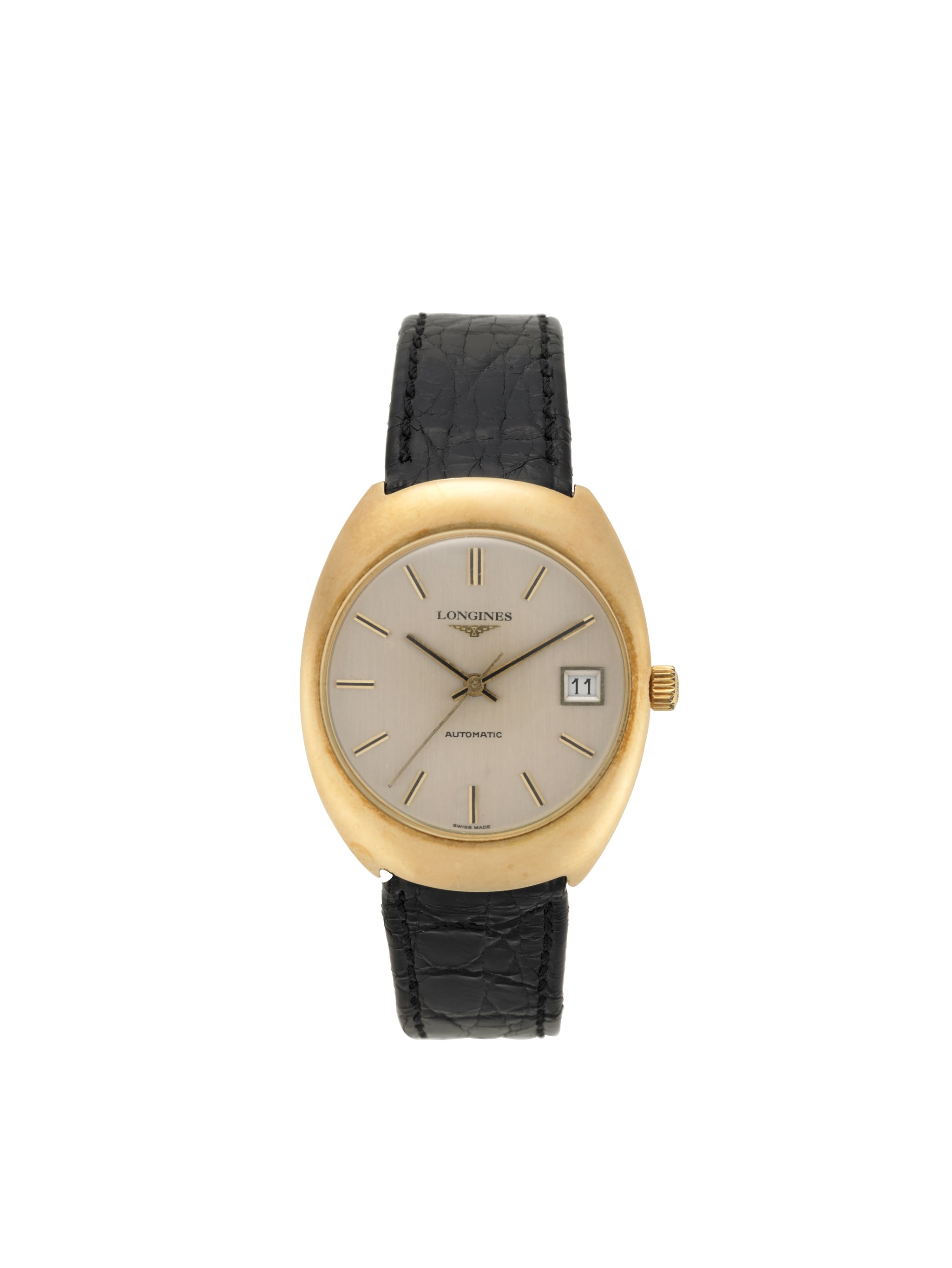 LONGINES Orologio da polso da uomo in oro 18K Anni '70 Quadrante, movimento e cassa firmati Movimento con carica automatica Quadrante argentato con indici riportati, data Cassa n. 00 314095 Misura mm 30x35 circa LONGINES Gent's 18k gold wristwatch 1970's Automatic wind movement Silvered dial with applied indexes