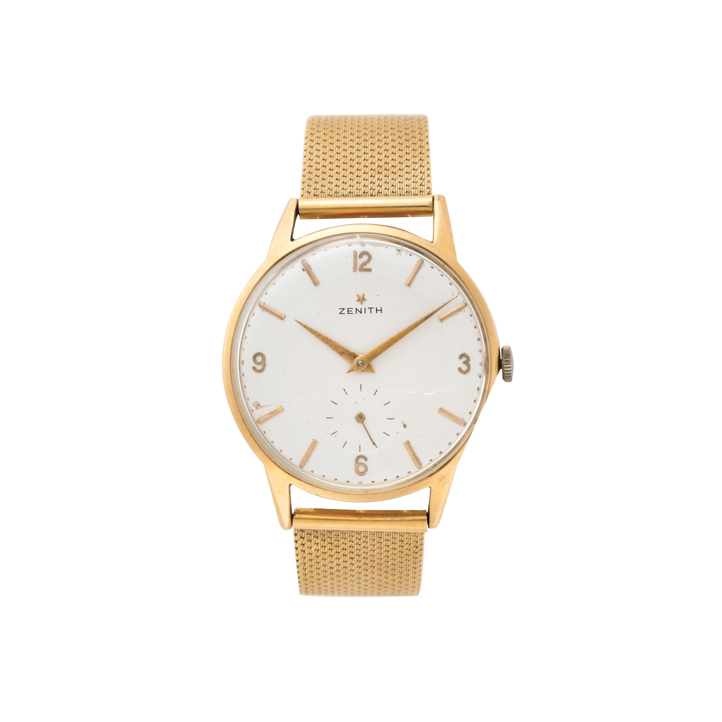 ZENITH Orologio da polso da uomo in oro 18K, completo di bracciale non pertinente in oro 18 K Epoca anni '60 Quadrante movimento e cassa firmati Movimento con carica manuale Quadrante argentato con cifre e indici riportati, piccoli secondi al sei Cassa n. 671390 Movimento n. 5134851 Diam. mm 37 Astuccio originale (difetti, quadrante ristampato) ZENITH Gent's 18k gold wristwatch, 18k gold wristband not pertinent 1960's Manual wind movement Original case (defects, reprinted dial)