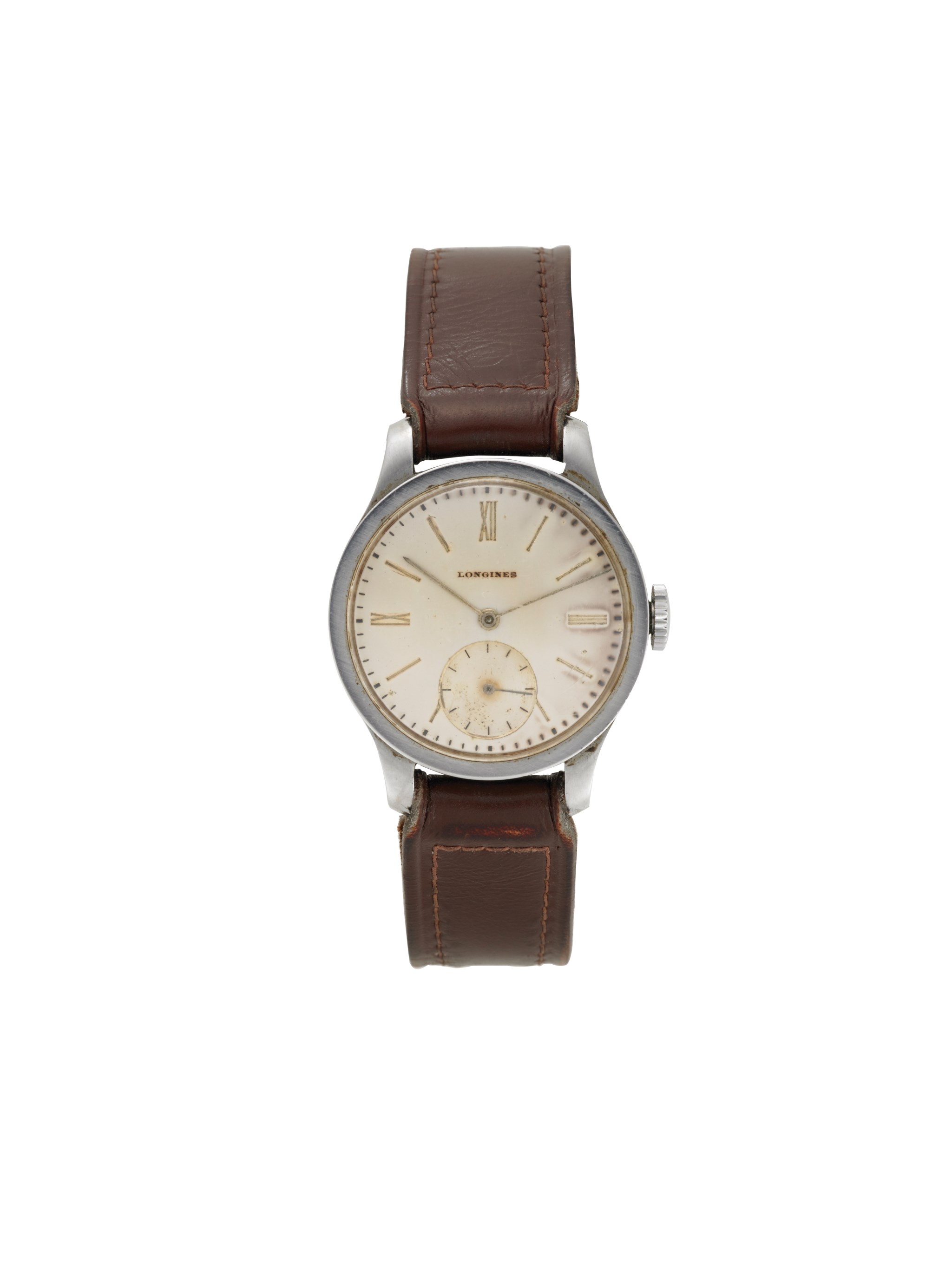 LONGINES Orologio da polso da uomo in acciaio Anni '40/'50 Quadrante movimento e cassa firmati Movimento con carica manuale Quadrante argentato con cifre romane e indici riportati Cassa n. 2106727963 Diam. mm 33 LONGINES Gent's steel wristwatch, 1940's/50's Manual wind movement Silvered dial with Roman numerals