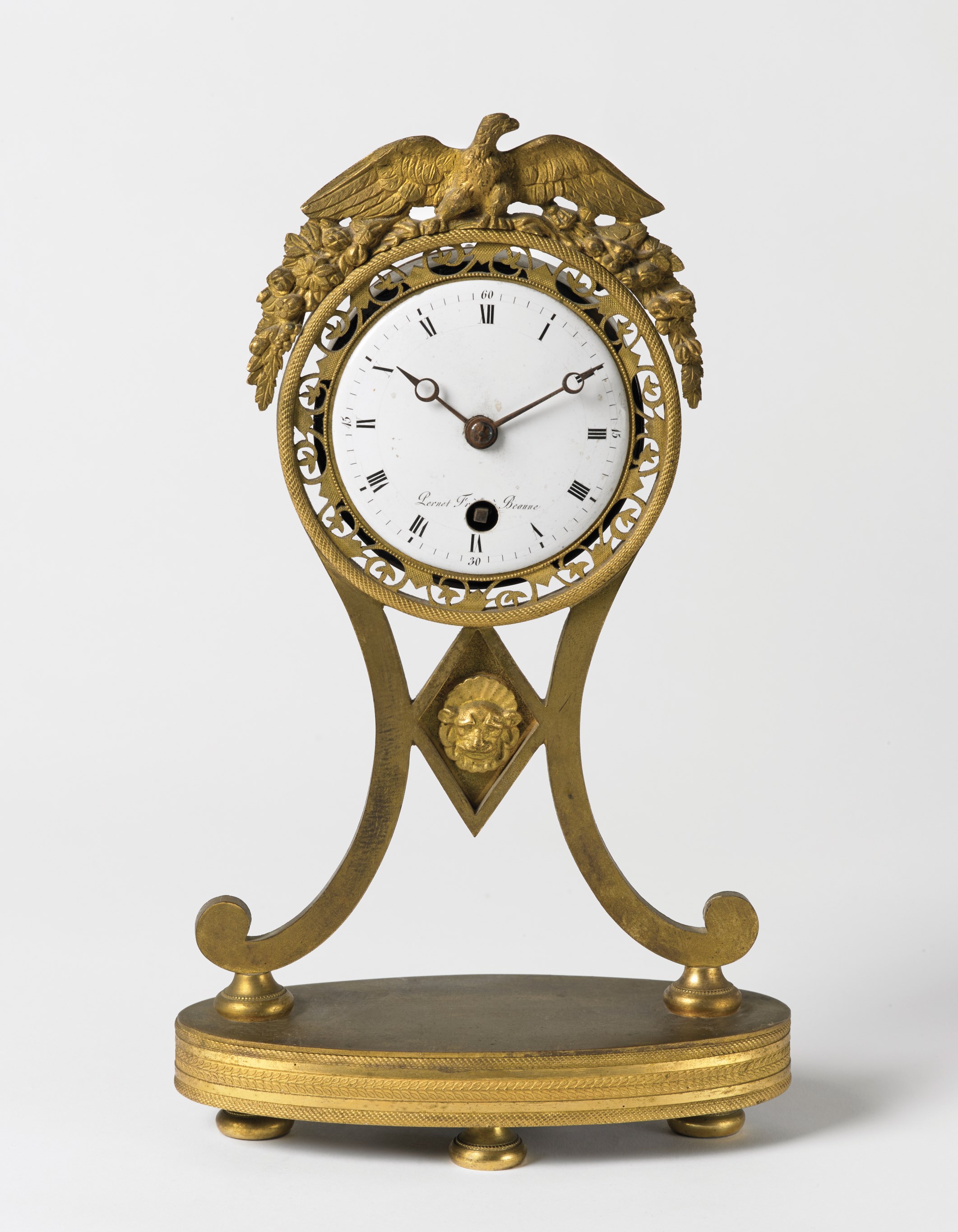 PERNET FR(...) BEAUNE Pendoletta in bronzo dorato su base ovale sormontata da un'aquila ad ali spiegate Epoca inizio sec. XIX Quadrante firmato Movimento con carica settimanale solo tempo, scappamento ad ancora. Quadrante smaltato, cifre romane e minuti in arabo Misura h cm 28 (mancante forcella di pendolo e pendolo) PERNET FR(...) BEAUNE Ormolu mantle clock with oval base Early 19th century Enamelled dial with Roman numerals and Arabic minutes (loss of pallet fork and pendulum)