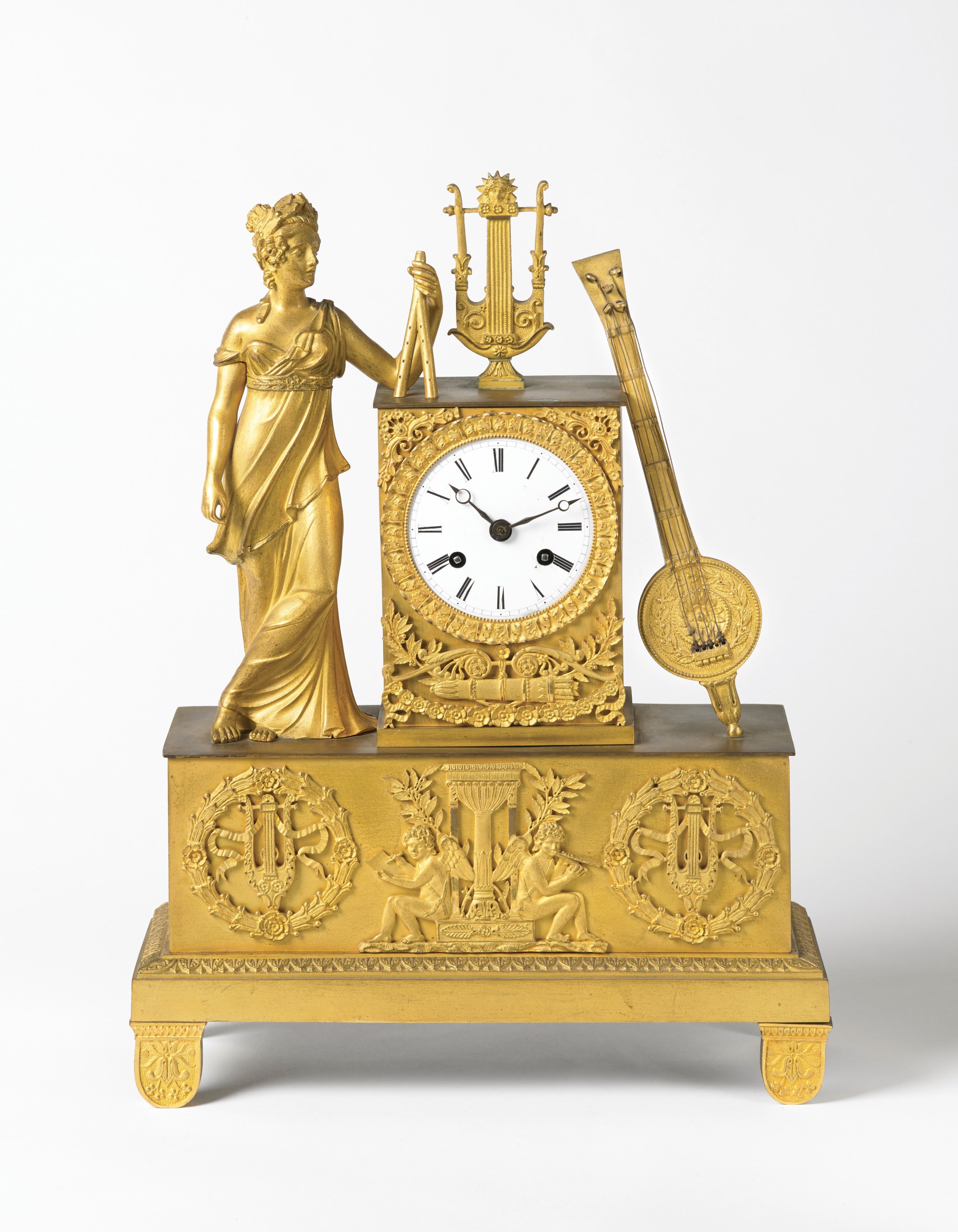 FRANCIA, ANONIMO Orologio da camino in bronzo dorato con cassa decorata da allegoria della musica Epoca 1820 circa (Carlo X) Movimento con carica settimanale con chiave, suoneria delle ore e delle mezze su campanello, scappamento ad ancora, sospensione a filo Quadrante in smalto bianco con cifre romane Misure cm 40x29x10 FRANCE, ANONYMUS Ormolu mantle clock representing the allegory of music Circa 1820 (Charles X) Key-wind movement with 10 day power reserve White dial with Roman numerals