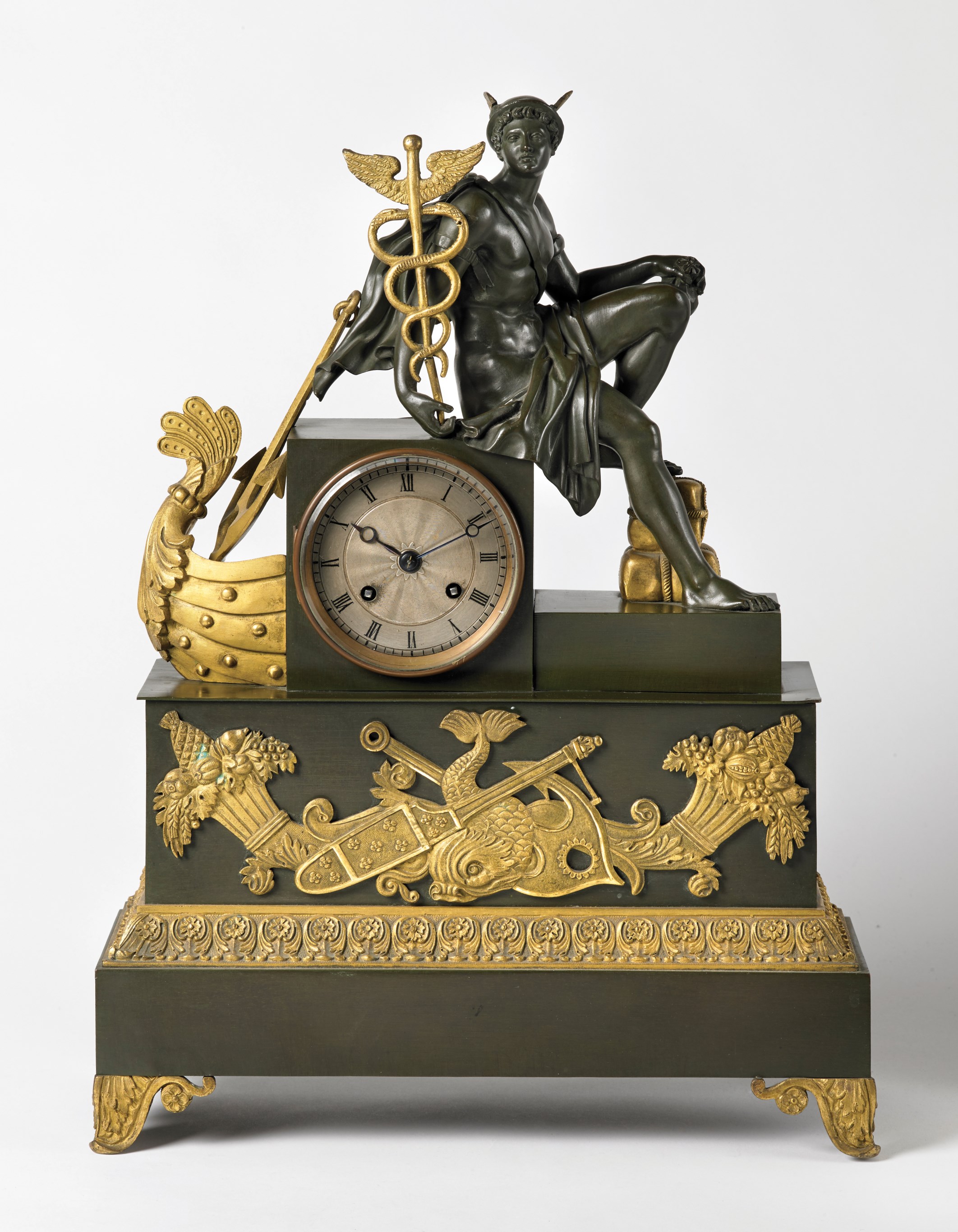 FRANCIA, ANONIMO Orologio da camino in bronzo dorato con cassa decorata con Mercurio che regge il caduceo Epoca 1820/30 (Carlo X) Movimento con carica settimanale a chiave, suoneria delle ore e delle mezze su campanello, scappamento ad ancora, sospensione a filo Quadrante argentato con cifre romane Misure cm 47x33x13 (probabili sostituzioni) FRANCE, ANONYMUS Ormolu mantle clock surmounted by Mercury holding the caduceus 1920's/30's (Charles X) Key- wind movement with weekly power reserve Silvered dial with Roman numerals (probable substitutions)
