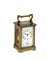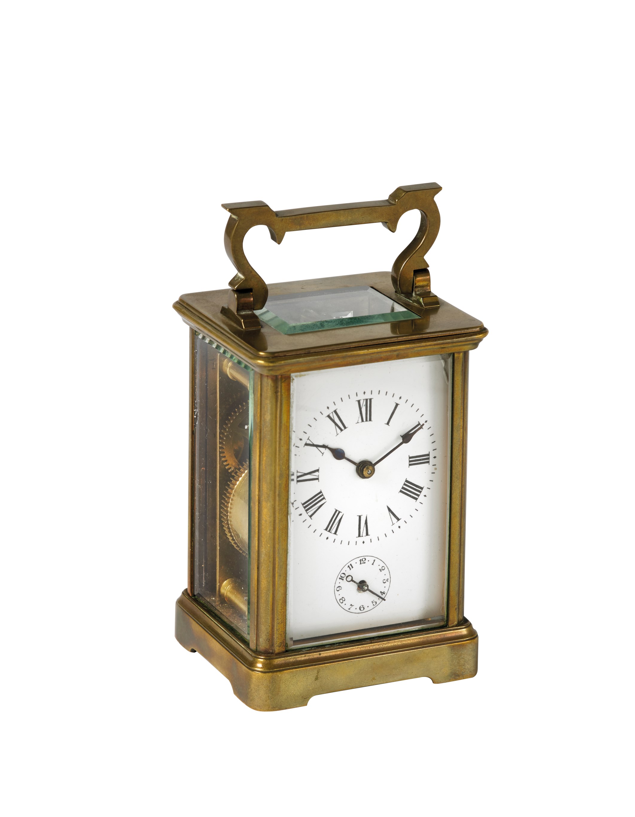 ANONIMO Officier, orologio da scrivania in ottone e cristalli molati Epoca fine sec. XIX inizio sec. XX Movimento con carica a chiave Quadrante smaltato bianco con cifre romane e piccolo quadrante al sei per puntamento sveglia con cifre arabe Misura h cm 14,8 Con scatola originale ANONYMUS Bevelled glass and brass carriage clock Late 19th / early 20th century Key-wind movement White enamel dial with Roman numerals Original box