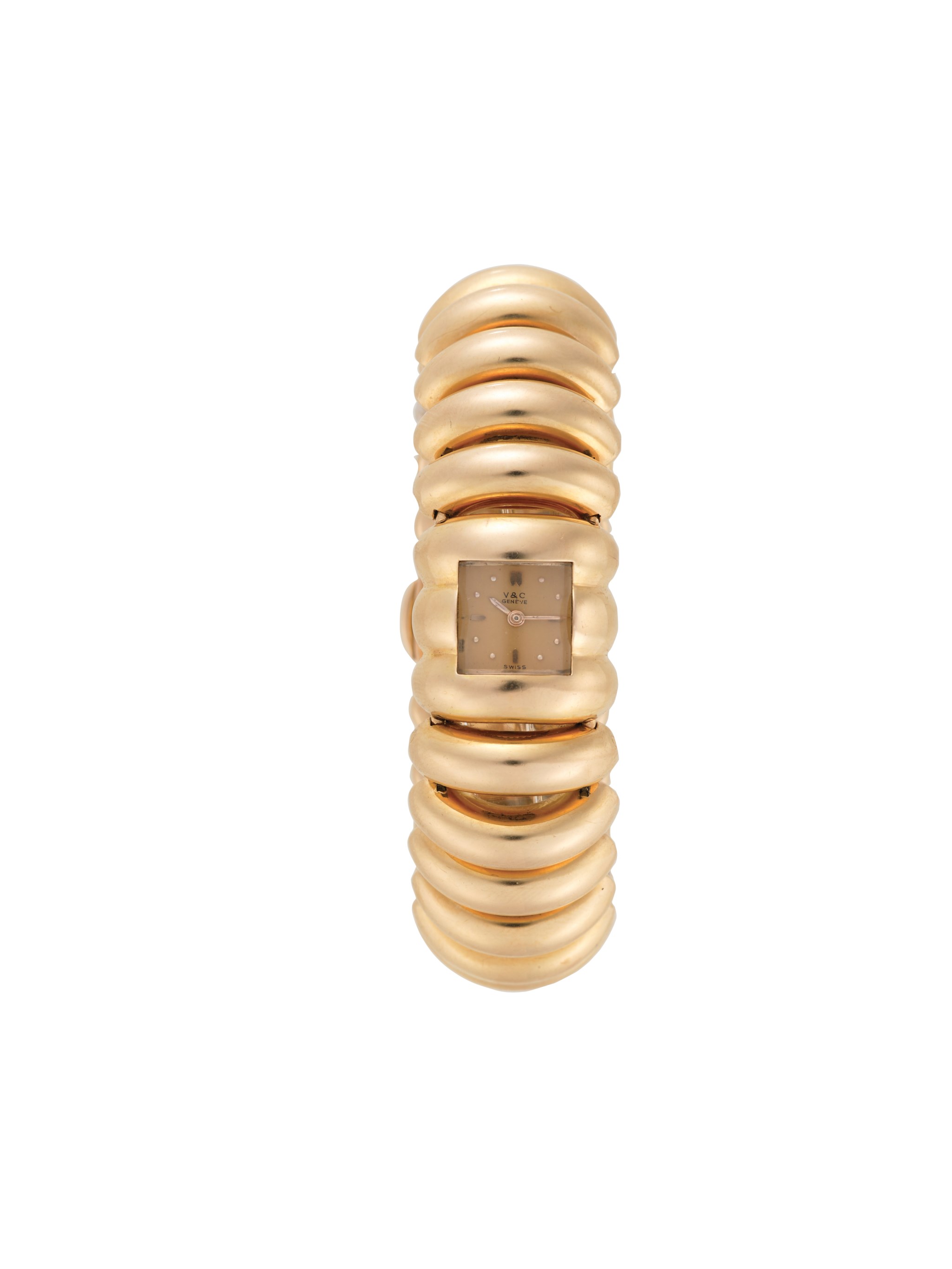 VACHERON ET CONSTANTIN Orologio da polso da donna in oro giallo 18 K Epoca anni '50 Quadrante, movimento e cassa firmati Movimento con carica manuale Quadrante champagne con indici riportati Cassa n. 269240 Misura 20x20 Completo di bracciale originale e maglie di scorta In astuccio originale VACHERON ET CONSTANTIN Lady's18k gold wristwatch, 1950's Manual- wind movement Champagne dial Complete with original wrisband and spare links In original case