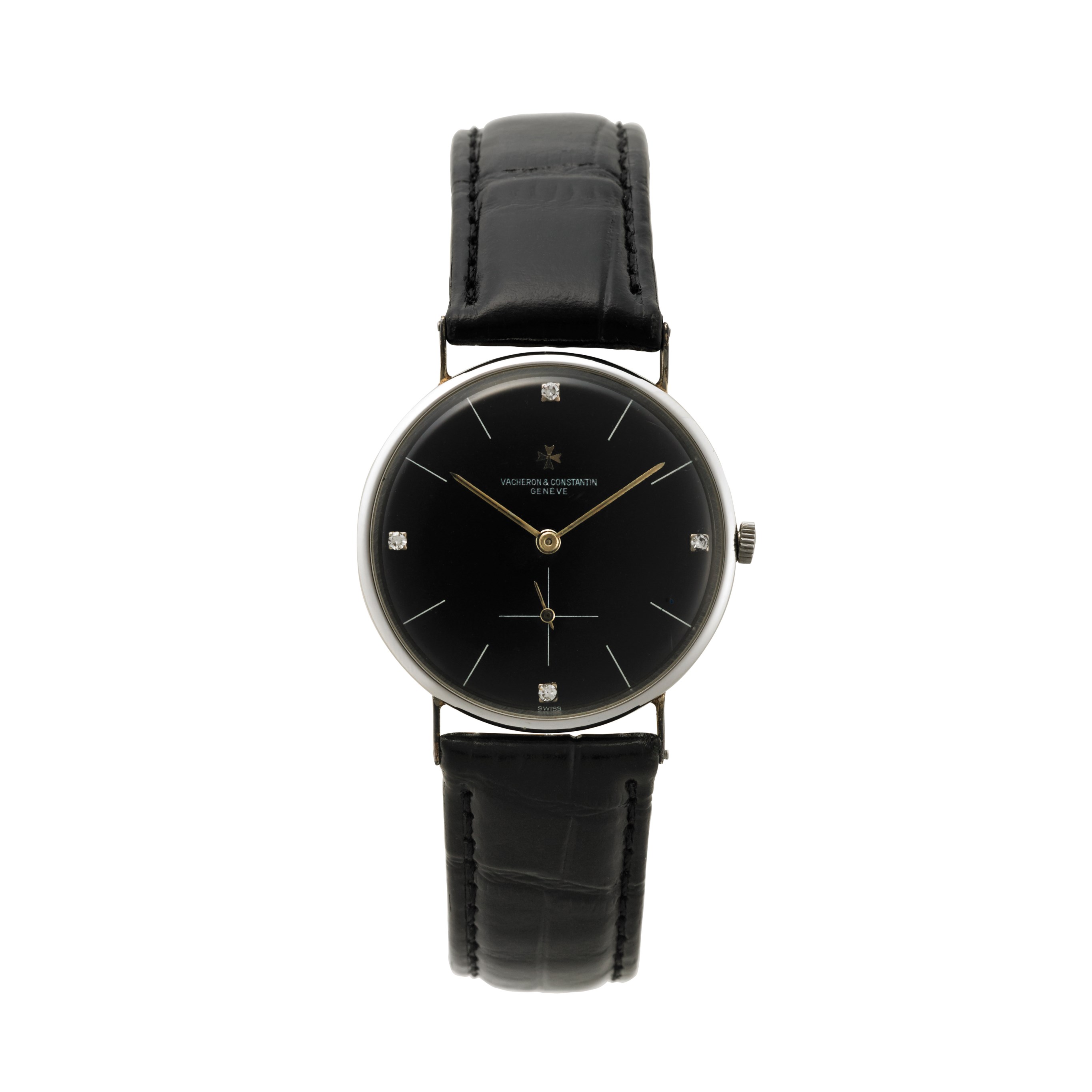 VACHERON CONSTANTIN Orologio da polso da uomo in oro bianco 18K Anni '50/60 Quadrante movimento e cassa firmati Movimento con carica manuale Quadrante nero con quattro indici riportati con diamanti Cassa n. 3893706571 Movimento n. 560808 Diam. mm 34 VACHERON CONSTANTIN Gent's 18k white gold wristwatch 1950's/60's Manual wind movement Black dial with four applied diamond indexes