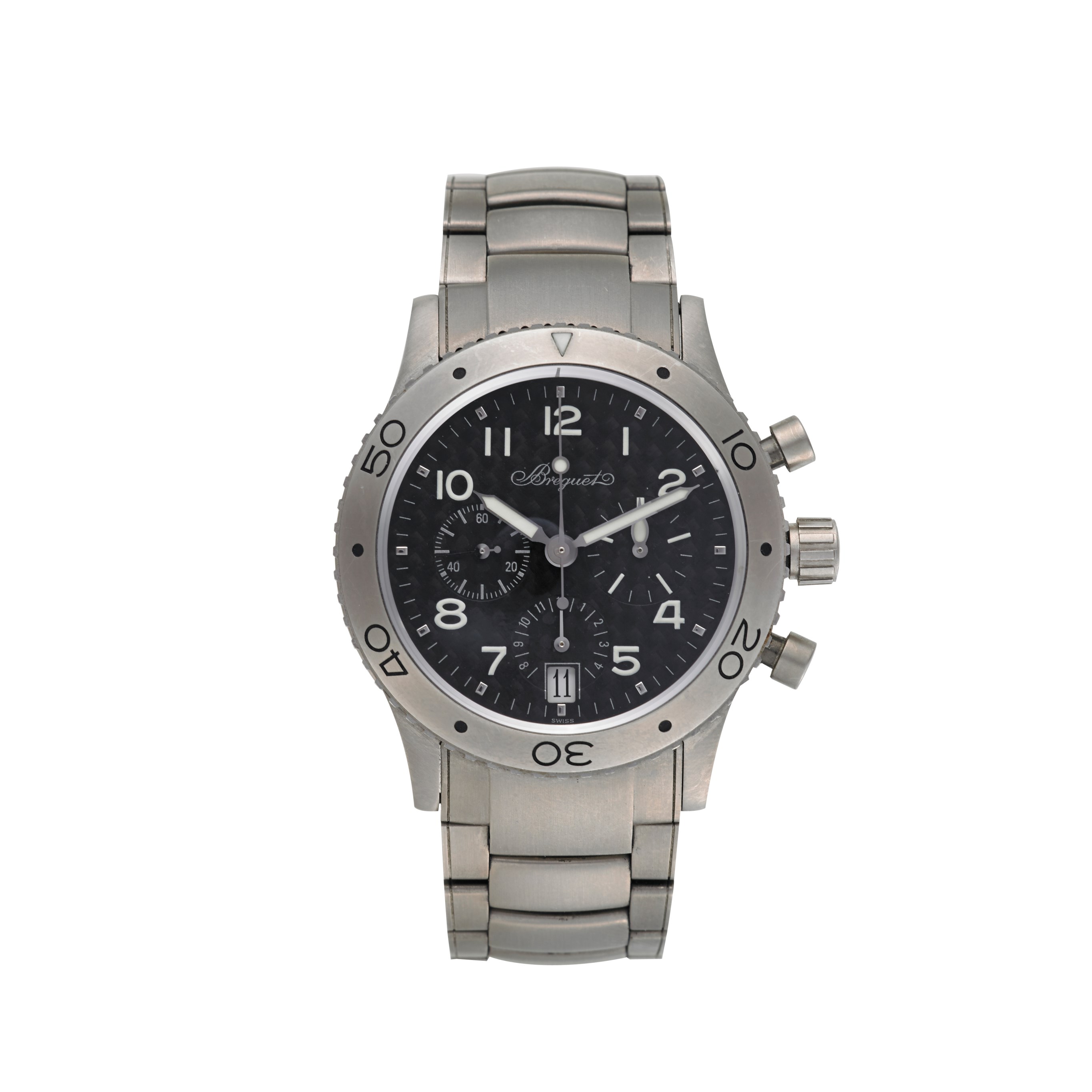BREGUET Cronografo Orologio da polso da uomo in titanio Anni 1990 ca. Quadrante, movimento e cassa firmati Movimento con carica automatica Quadrante con cifre arabe, quadrantini ausiliari con minuti, ore e secondi Type XX Cassa n. 75885 Diam. mm 40 Con scatola e garanzia BREGUET Chronograph Gent's titanium wristwatch Automatic-wind movement Dial with Arabic numerals With box and guarantee