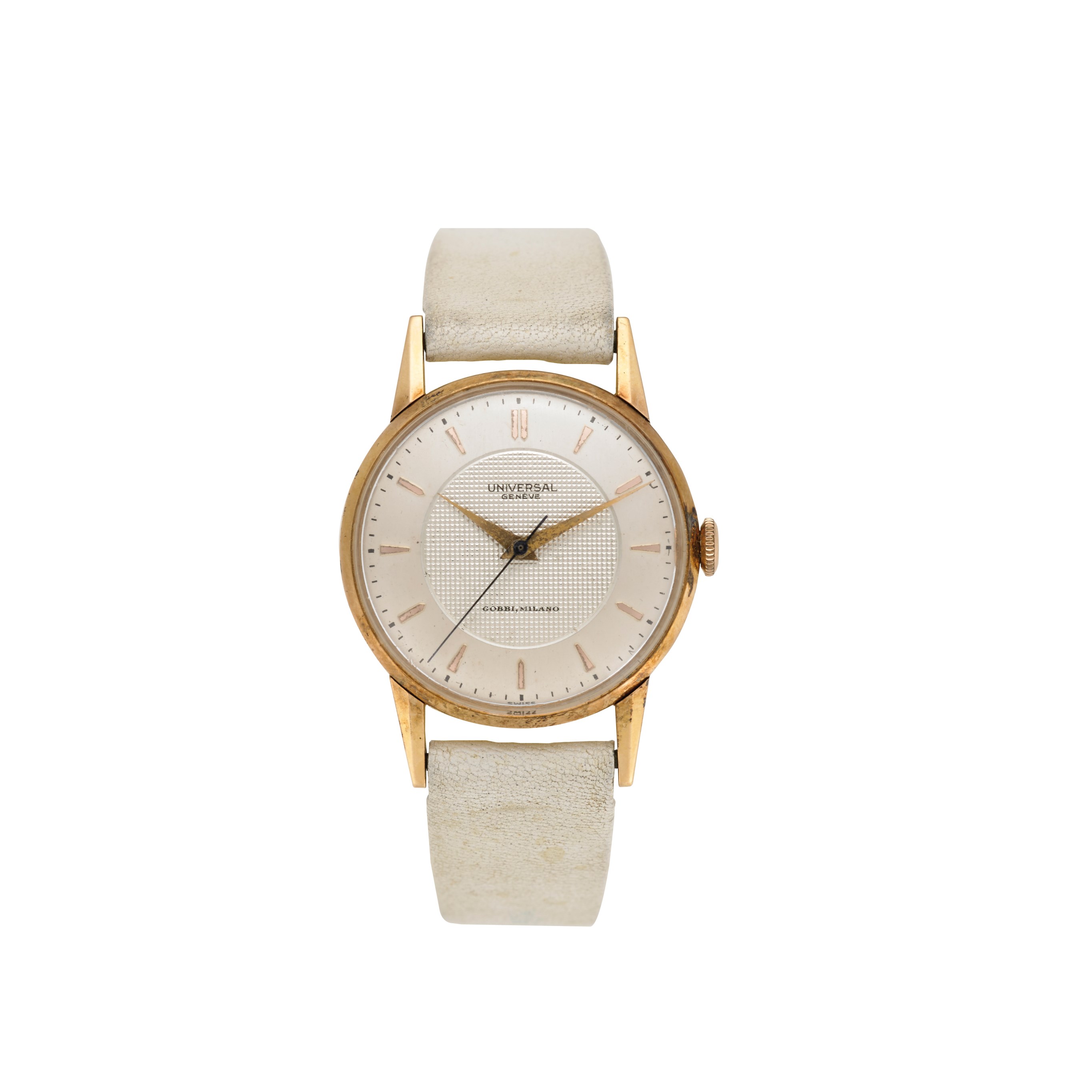 UNIVERSAL Orologio da polso da donna in oro 18K Anni 1950 ca. Quadrante, movimento e cassa firmati Movimento con carica manuale Quadrante argentato con indici riportati, secondi al centro Calibro n.231, ref. n.1414917-18907 Diam. mm 30 UNIVERSAL Lady's gold wristwatch Manual-wind movement Silver-plated dial with applied time indicators