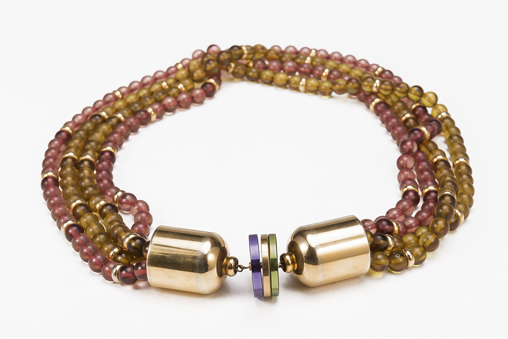 Collana lunga a quattro fili con boules rosa antico e verdastro in materiale plastico, finiture in metallo color oro
