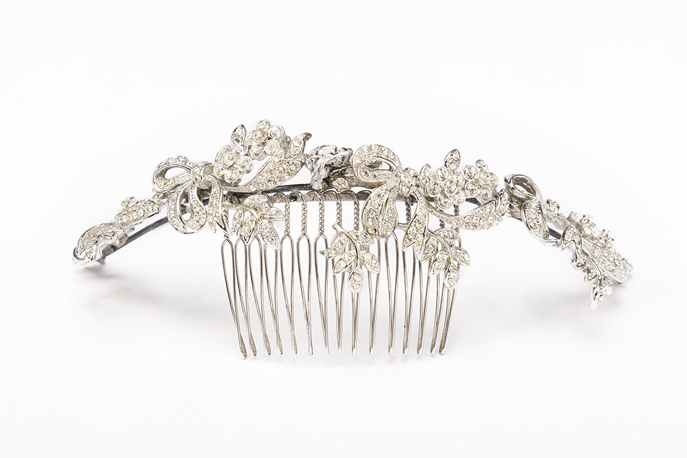 BERGDORF GOODMAN, NEW YORK Diadema in metallo nickelato con strass incolori a ricordare i diademi di fine 800/inizio 900 (difetti)