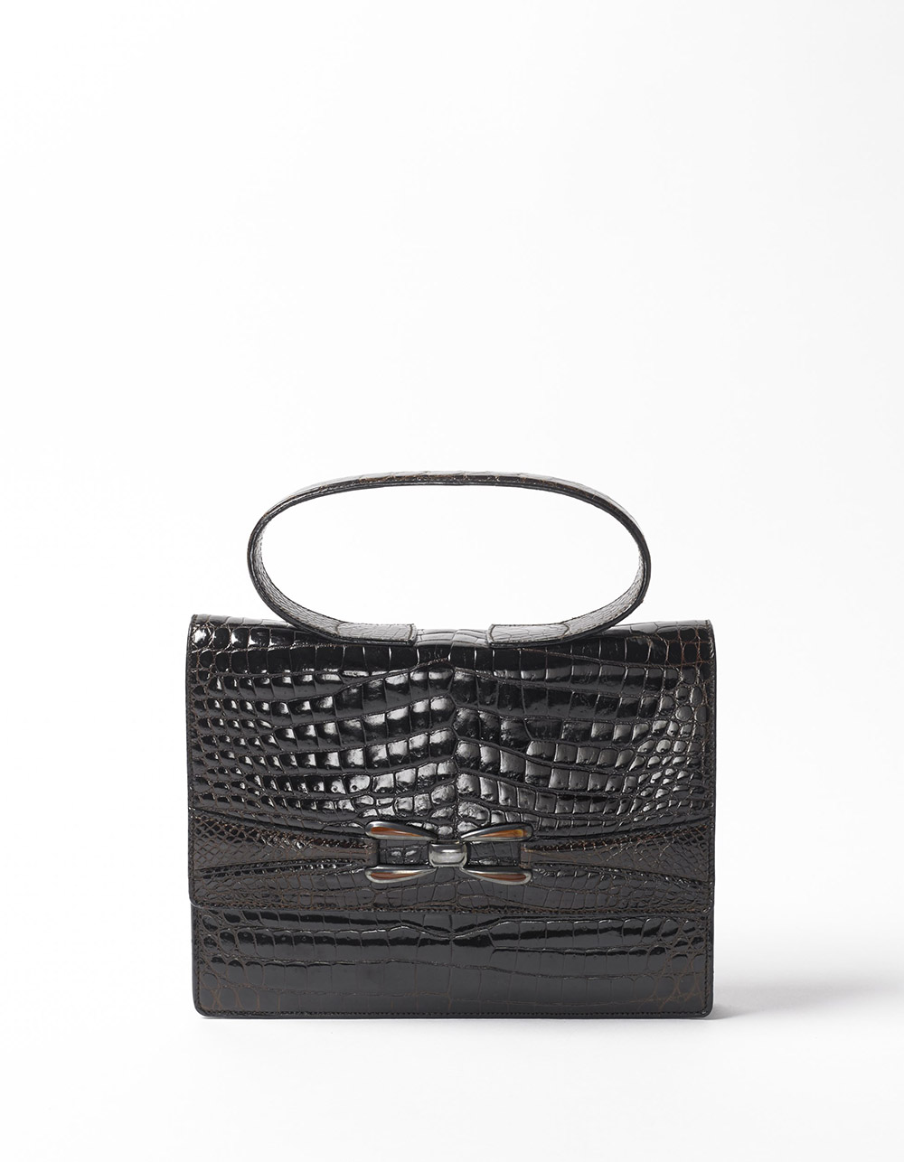 GHERARDINI Borsa in coccodrillo a mano a un manico con chiusura in metallo e bachelite sagomata, cm 22. Pre-Convenzione Cites