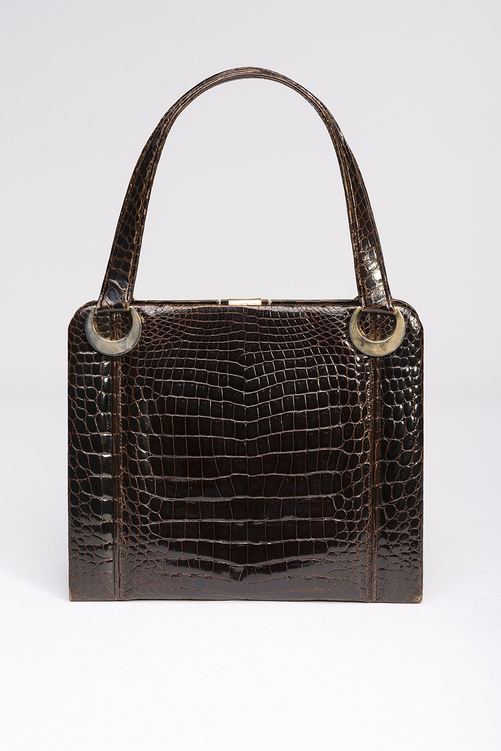 Borsa a tre scomparti in coccodrillo testa di moro con rifiniture dorate (cm 23)