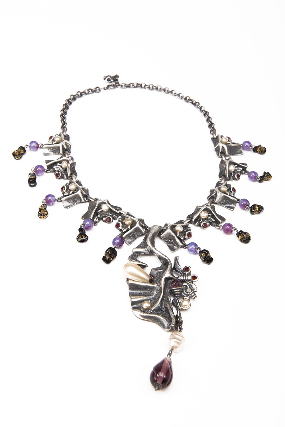 BELLINI Collana scultura a ricordare l'argento invecchiato, perle fancy bianche e boules viola come la goccia pendente