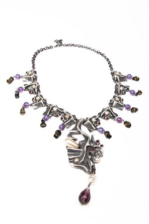 BELLINI Collana scultura a ricordare l'argento invecchiato, perle fancy...