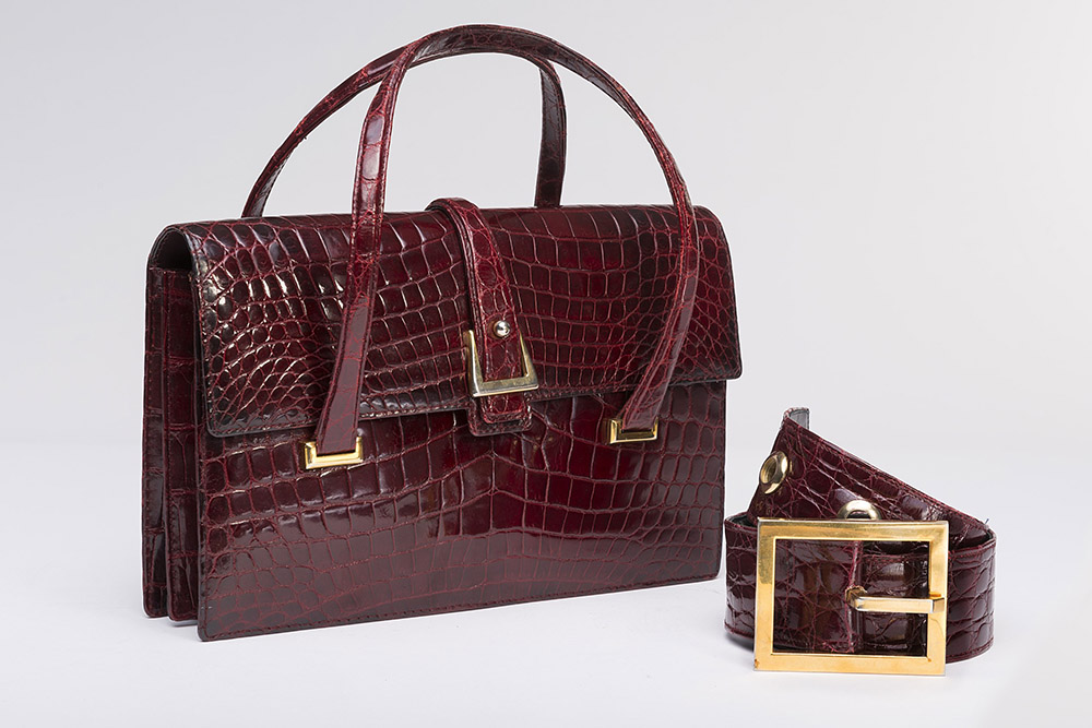 Lotto composta da una borsa in coccodrillo bordeaux unita ad una cintura con fibbia color oro, cm 27, cintura cm 80 ca. (segni d'uso)