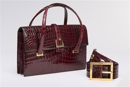 Lotto composta da una borsa in coccodrillo bordeaux unita ad una cintura con...