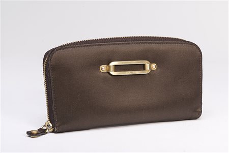 JIMMY CHOO Portafoglio in raso color marrone molto scuro con scatola e sacchetto originali, cm 19,50