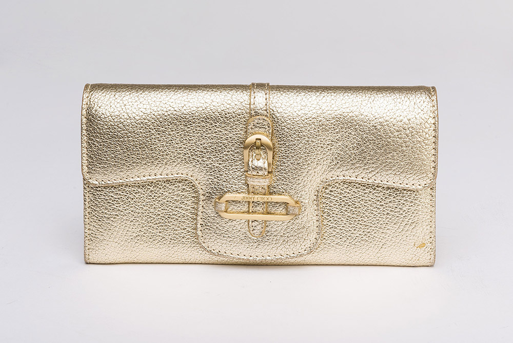 JIMMY CHOO Portafogli color oro con custodia, scatola e certificato di...